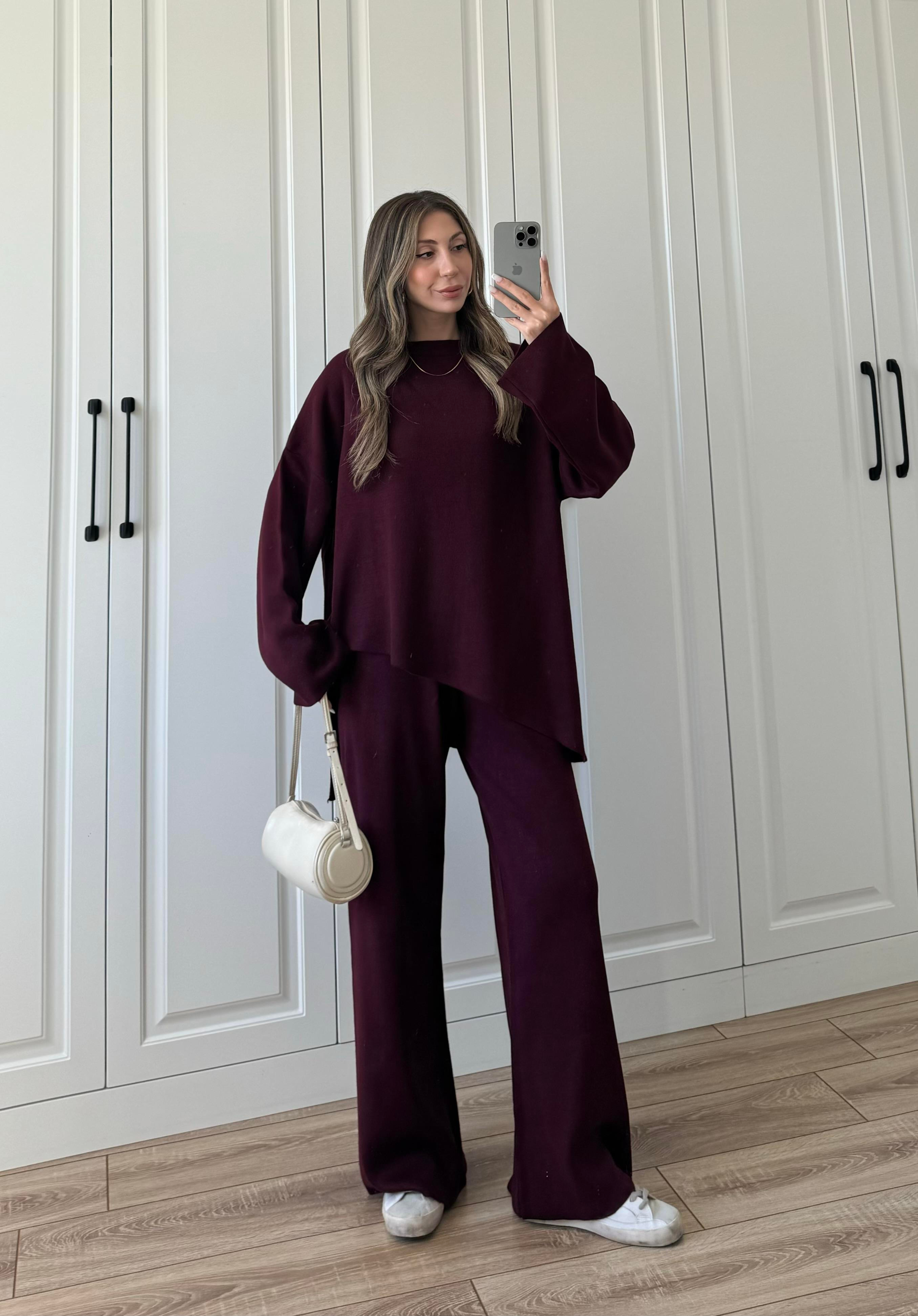 Asimetrik Çapraz Kesim Bordo Triko Takım