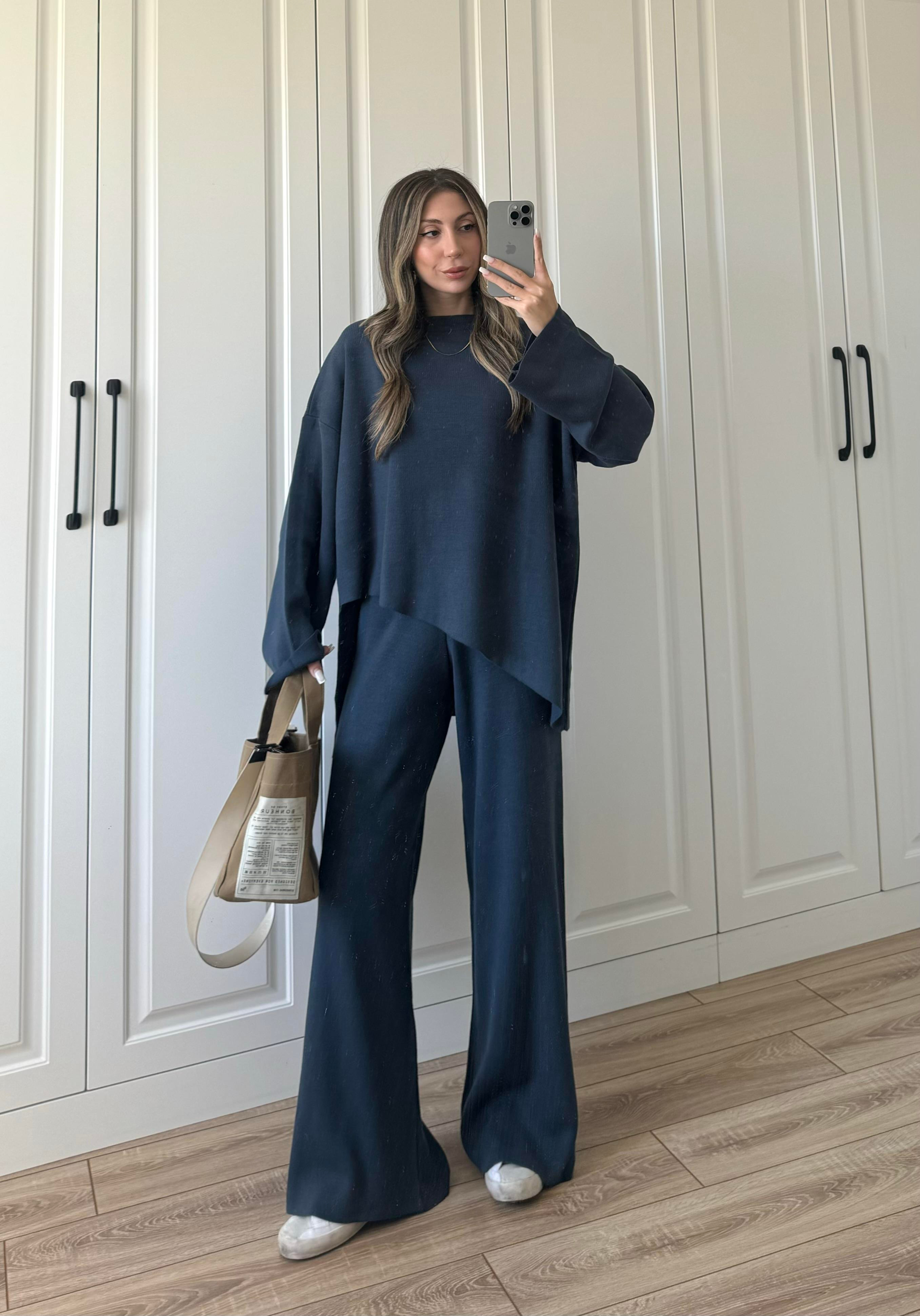 Asimetrik Çapraz Kesim İndigo Triko Takım