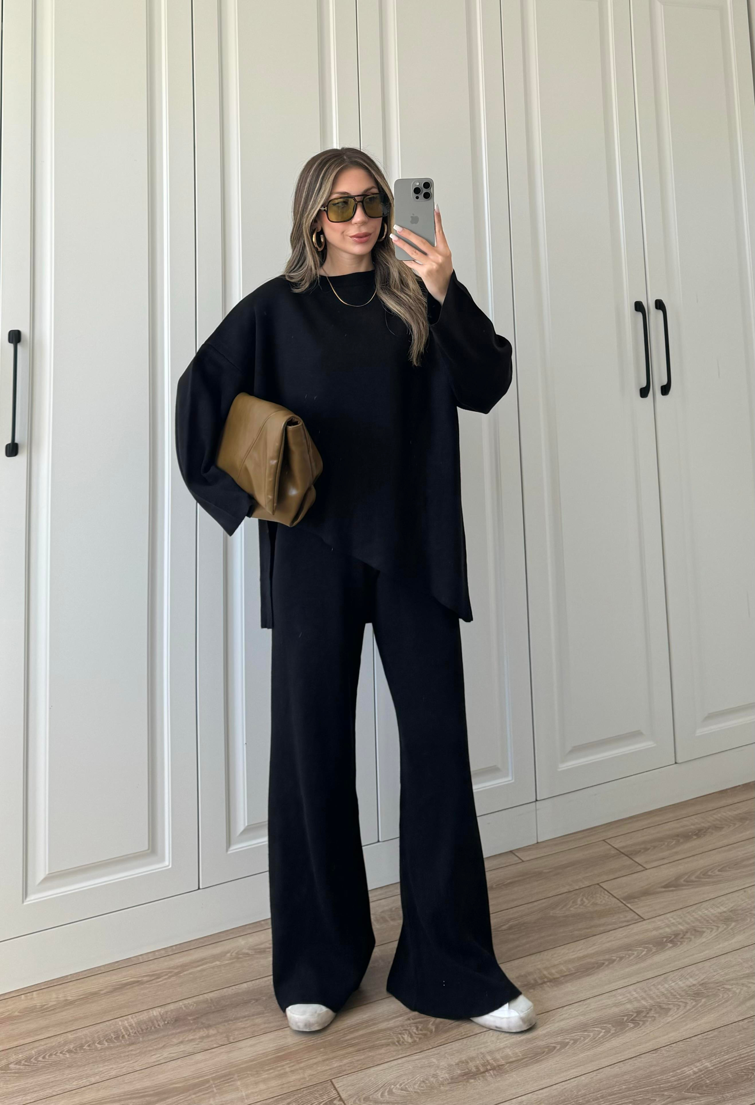Asimetrik Çapraz Kesim Siyah Triko Takım