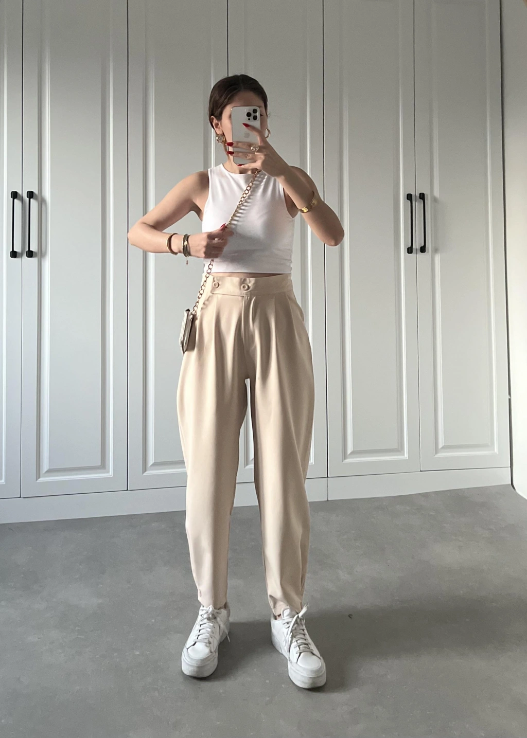 Beli Çift Düğme Detaylı Taş Kumaş Pantolon
