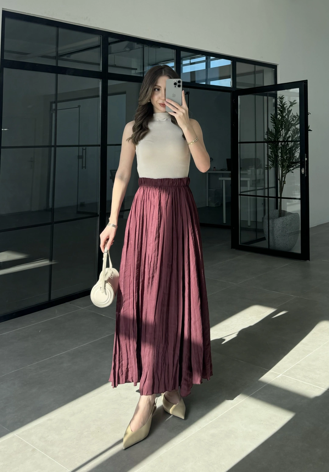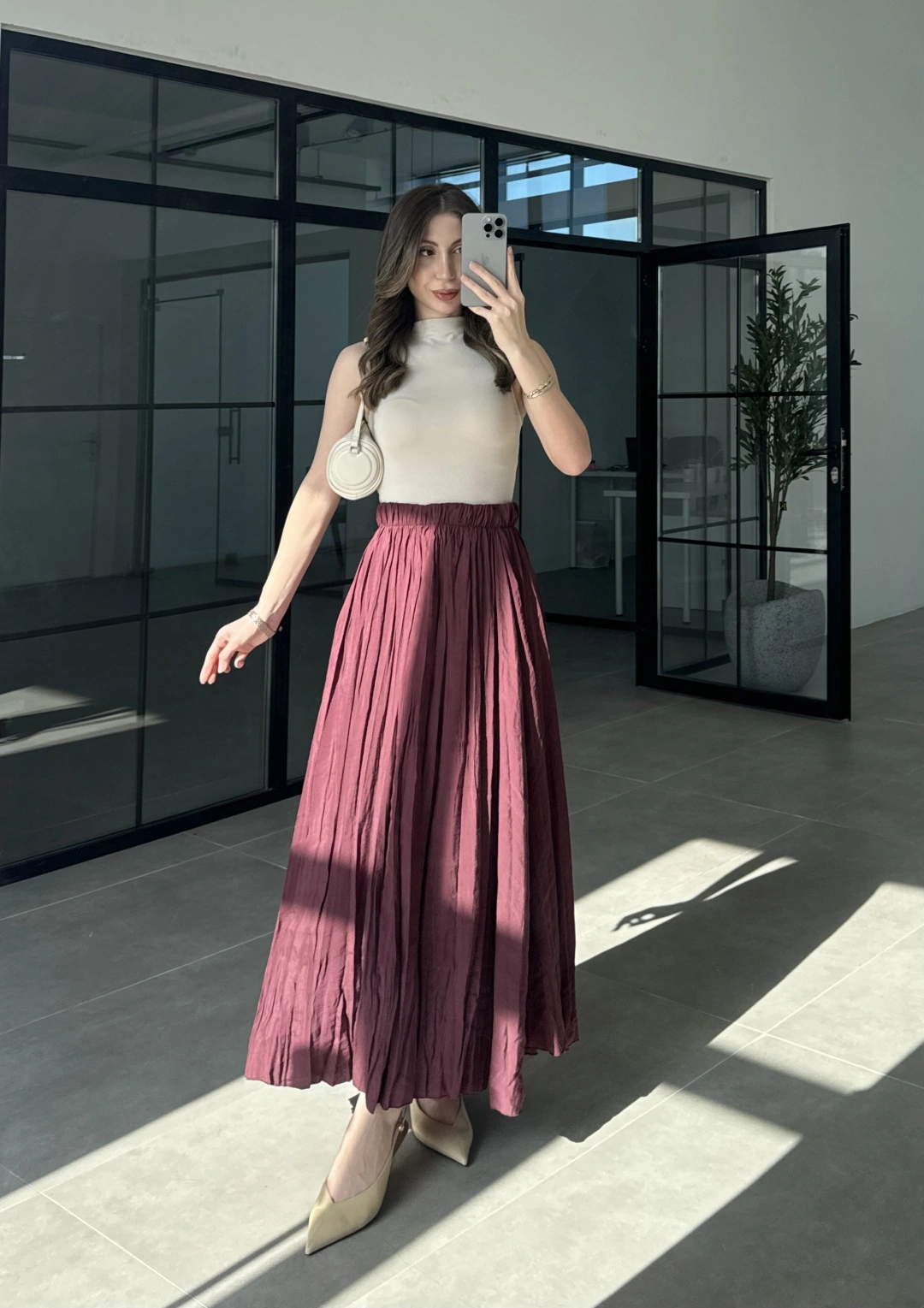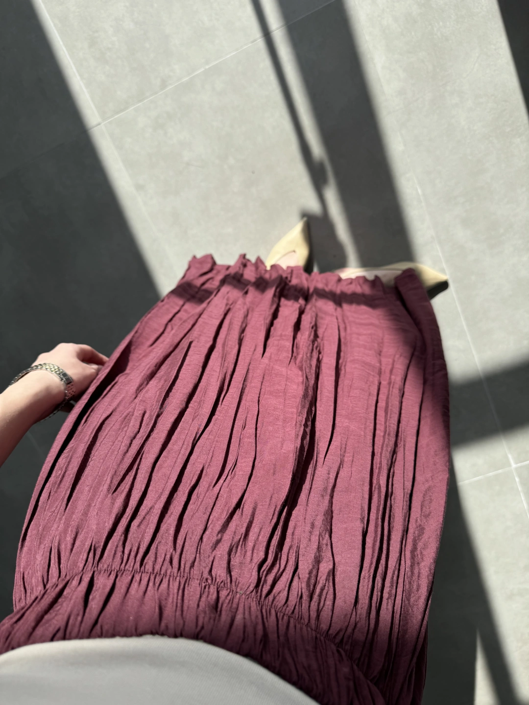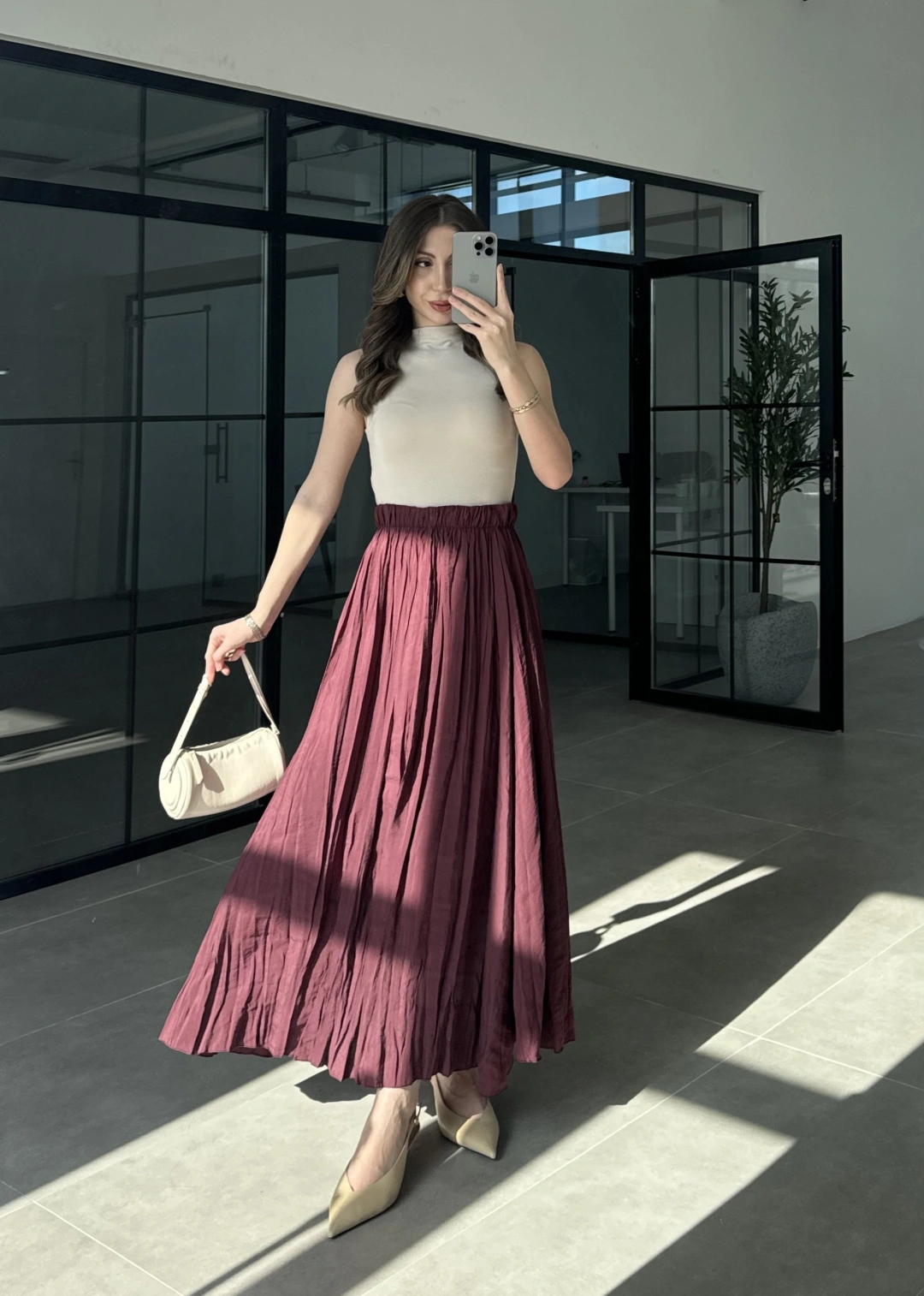 Beli Lastikli Bordo Tensel Kırışık Etek