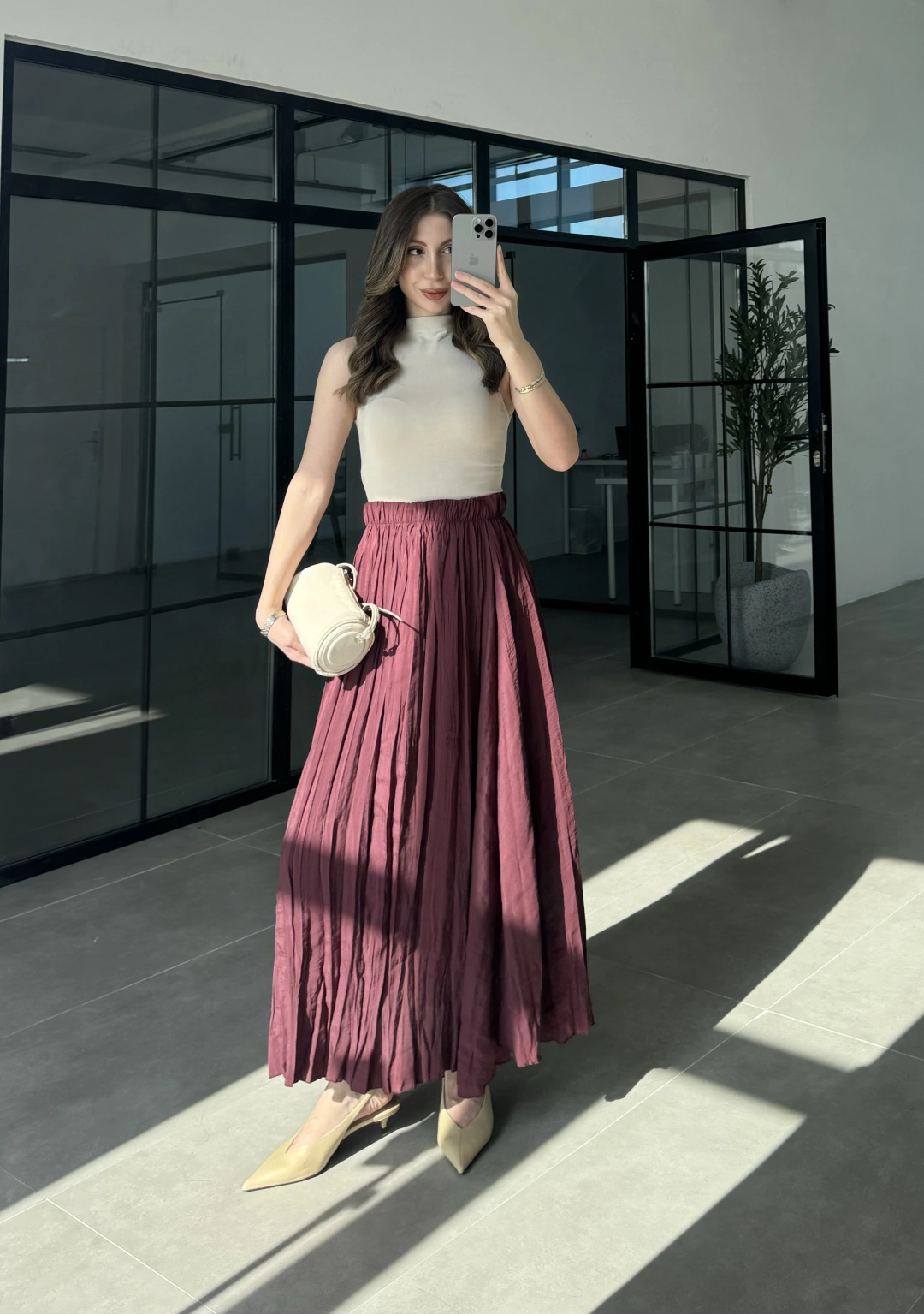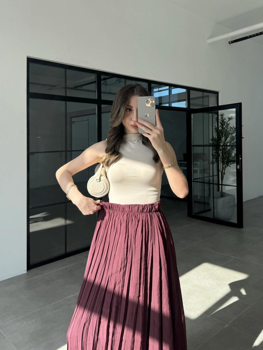 Tasarım Kemerli Önden Yırtmaçlı Pileli Mürdüm Etek
