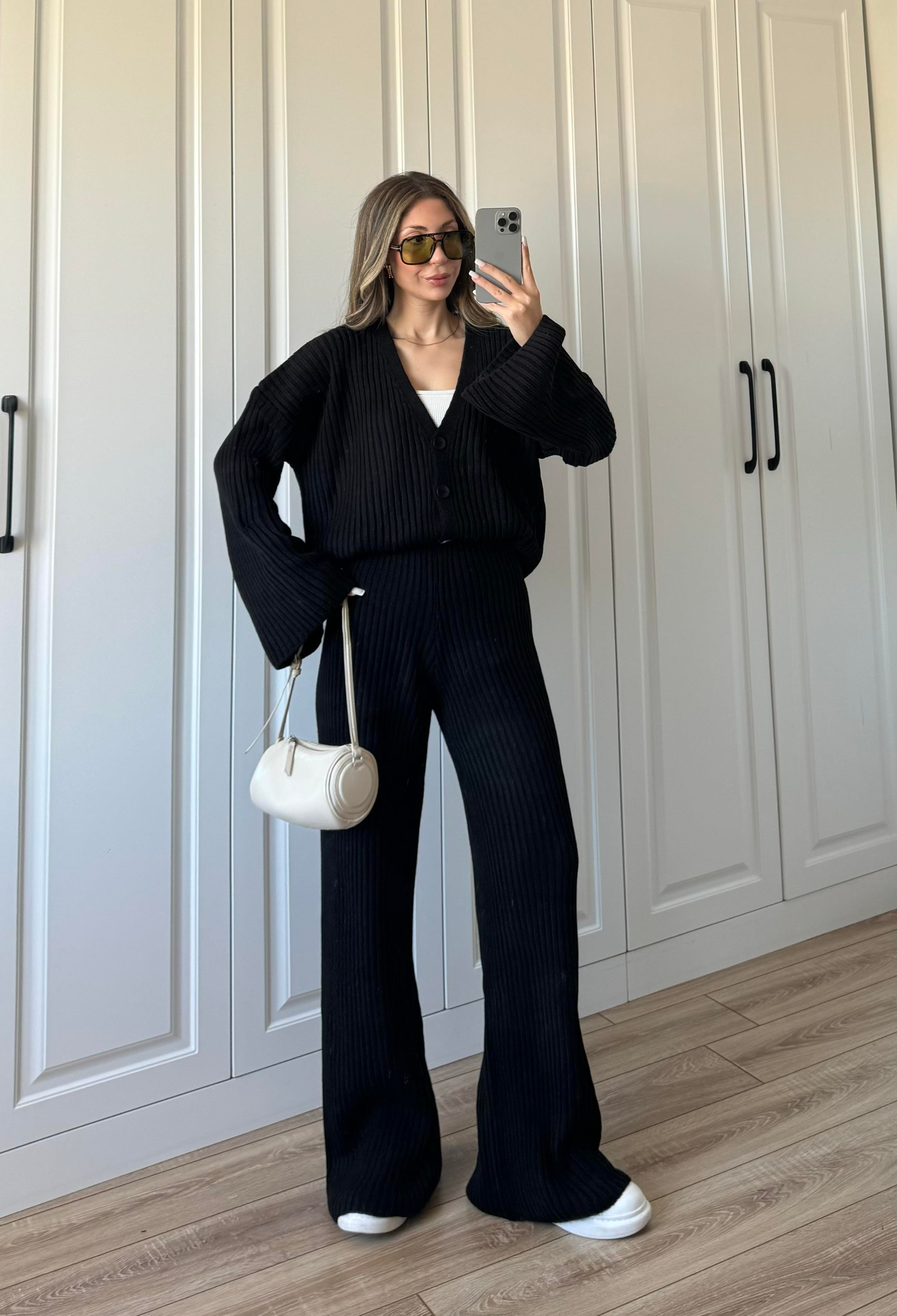Bonte Basic Fitilli Triko Siyah Hırka Takım