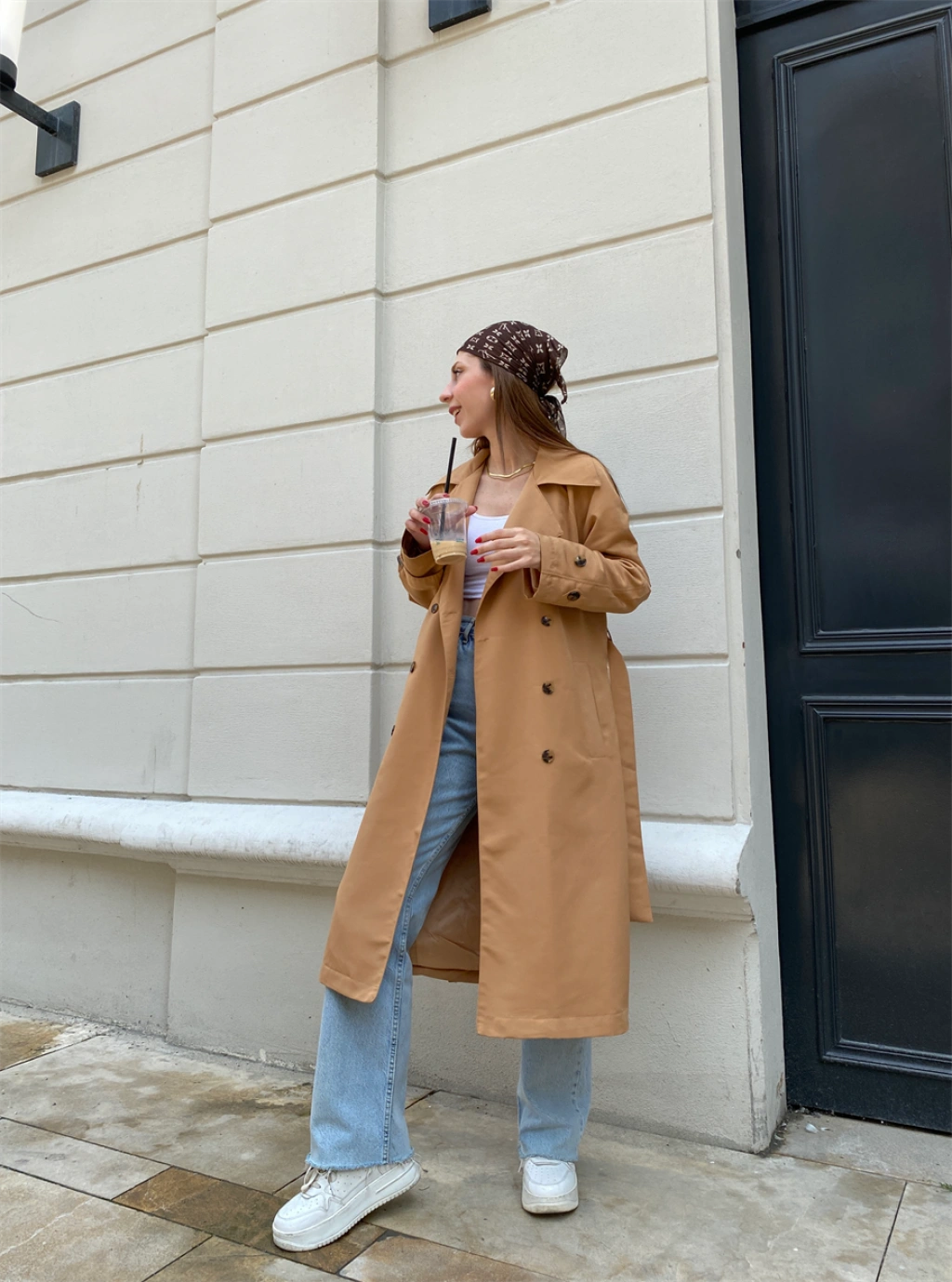 Aria Kuşaklı Astarlı Premium Kahve Trençkot