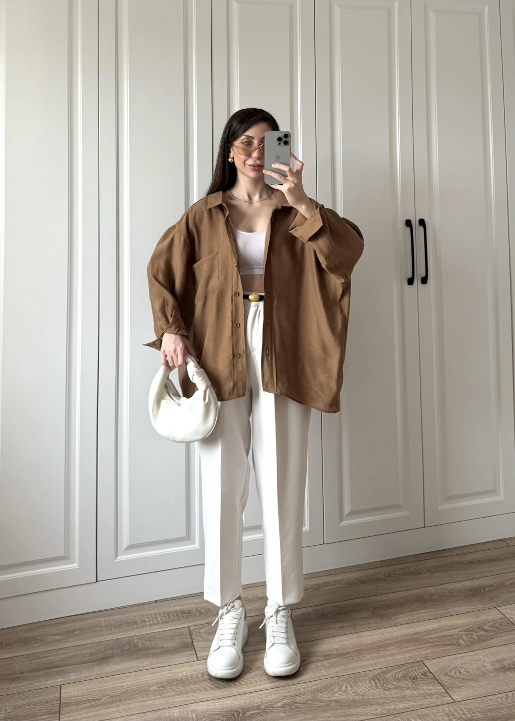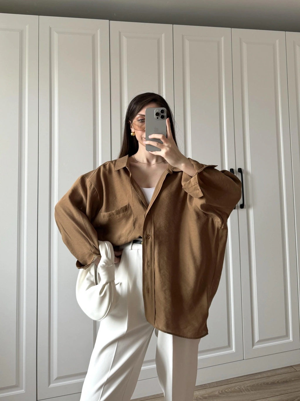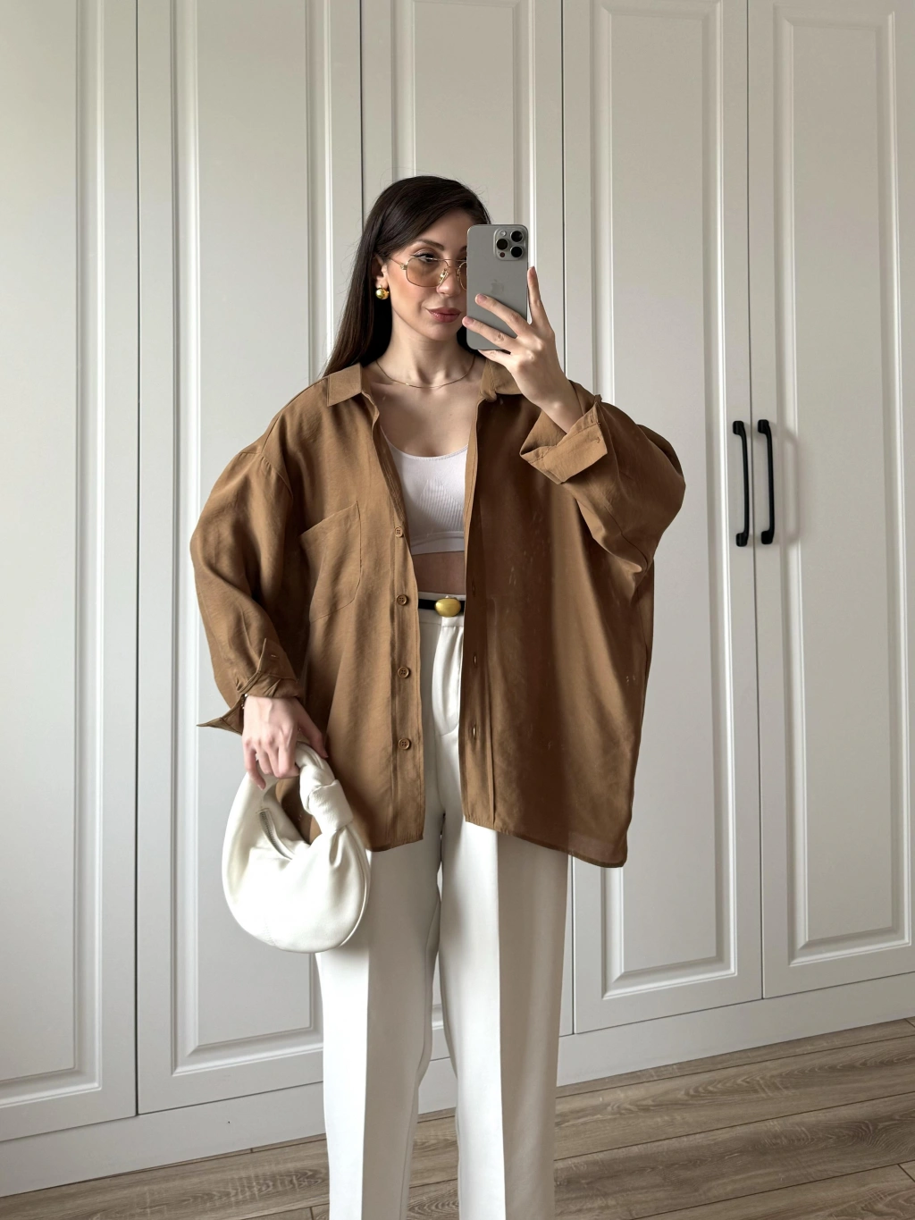 Sofi Düğmeli Oversize Kahve Crep Kumaş Gömlek