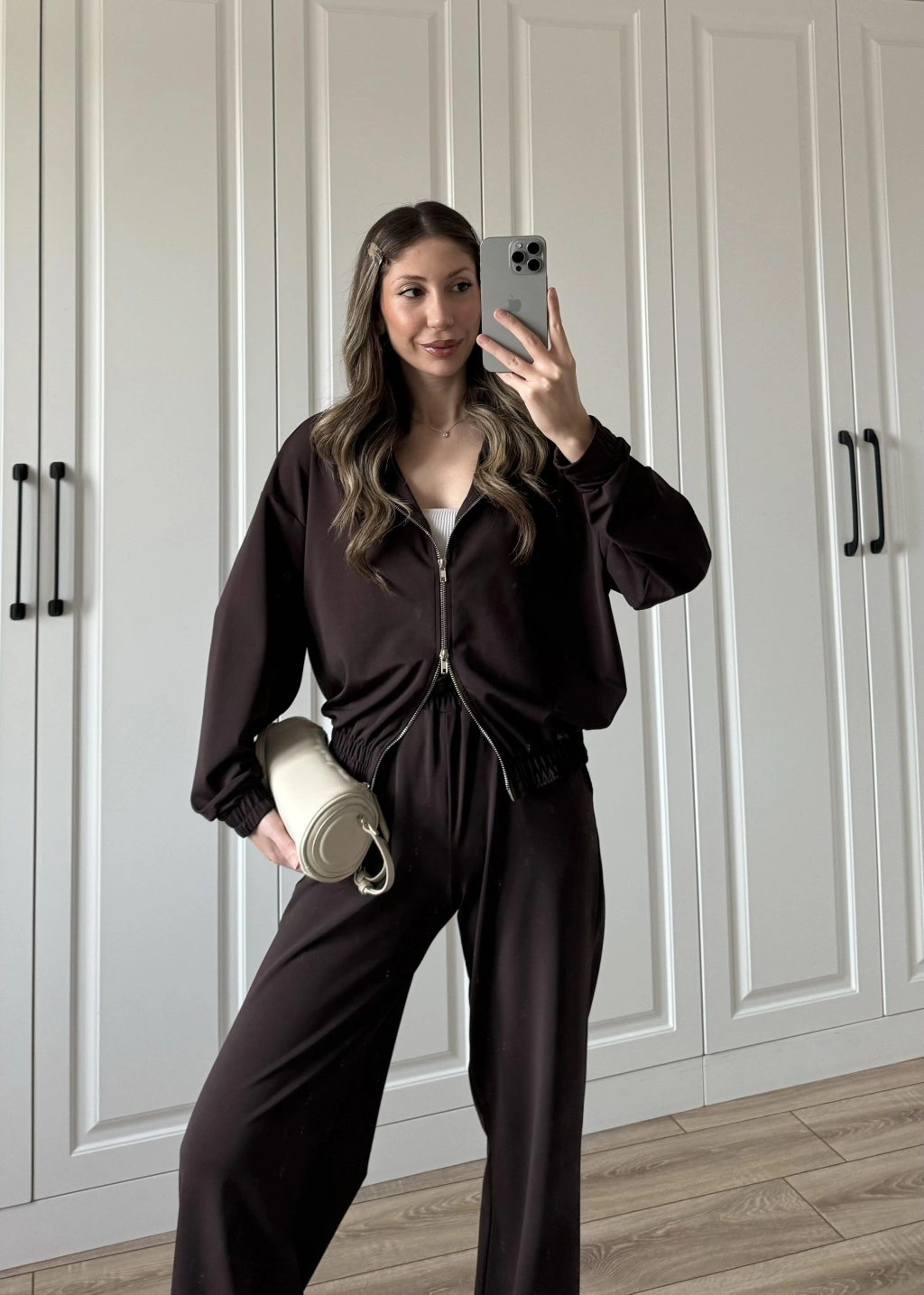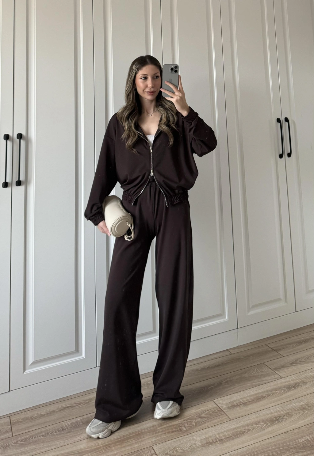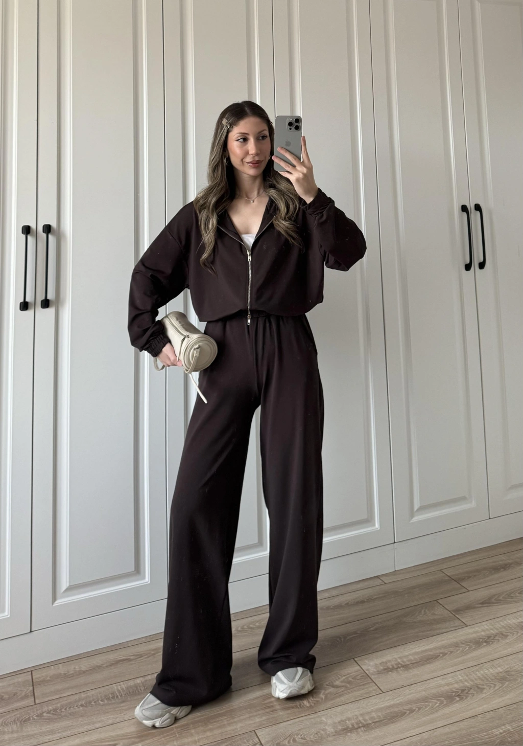 Üç İplik Şardonlu Oversize Kahve Takım