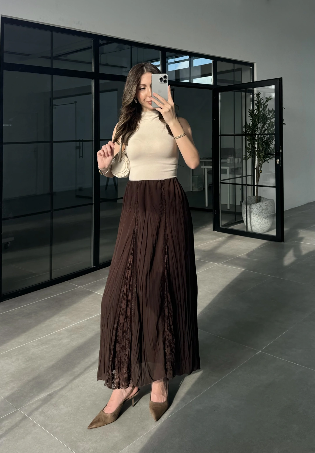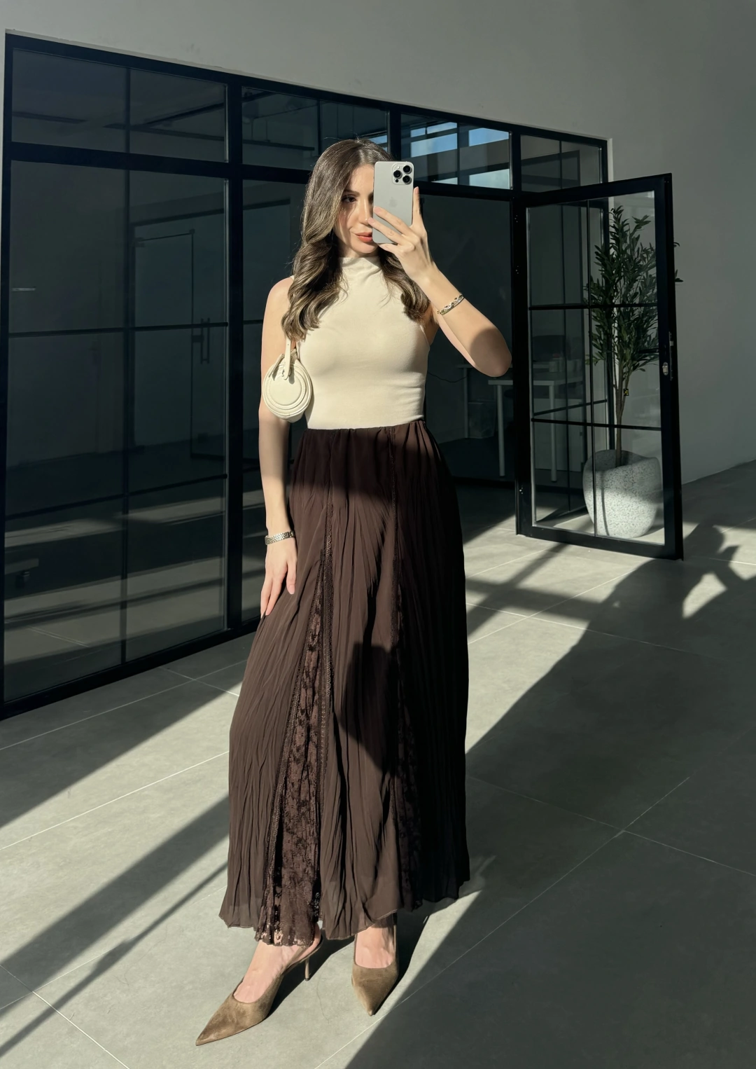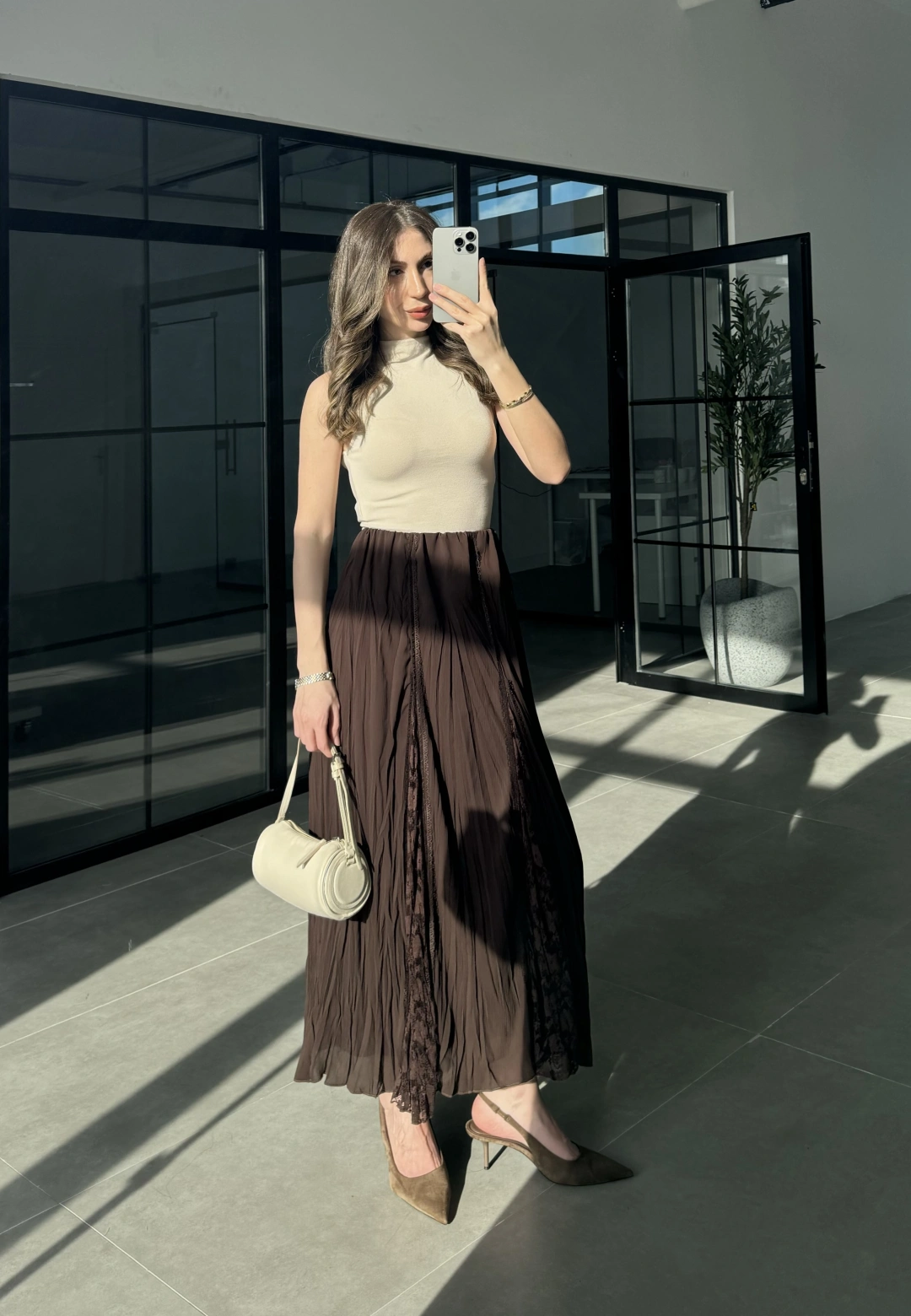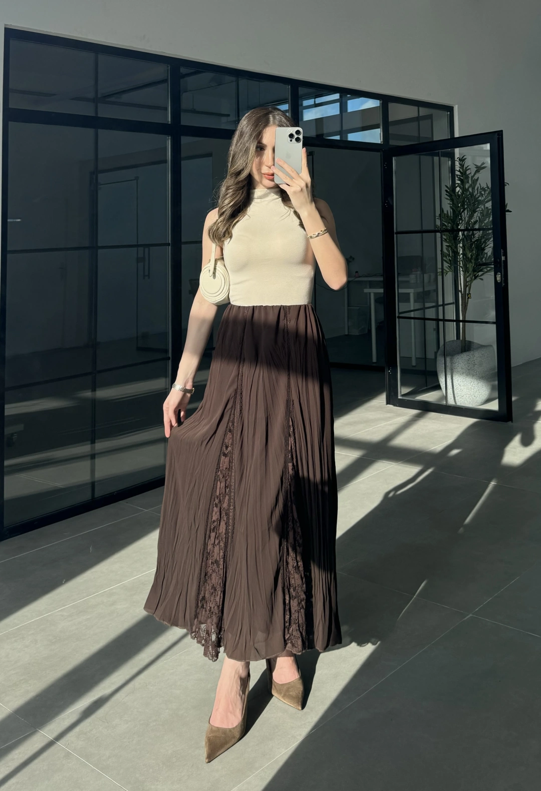 Tasarım Kemerli Önden Yırtmaçlı Pileli Taş Etek