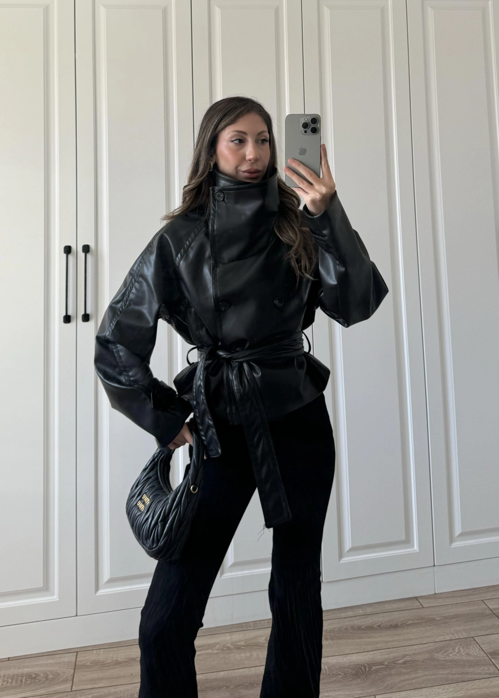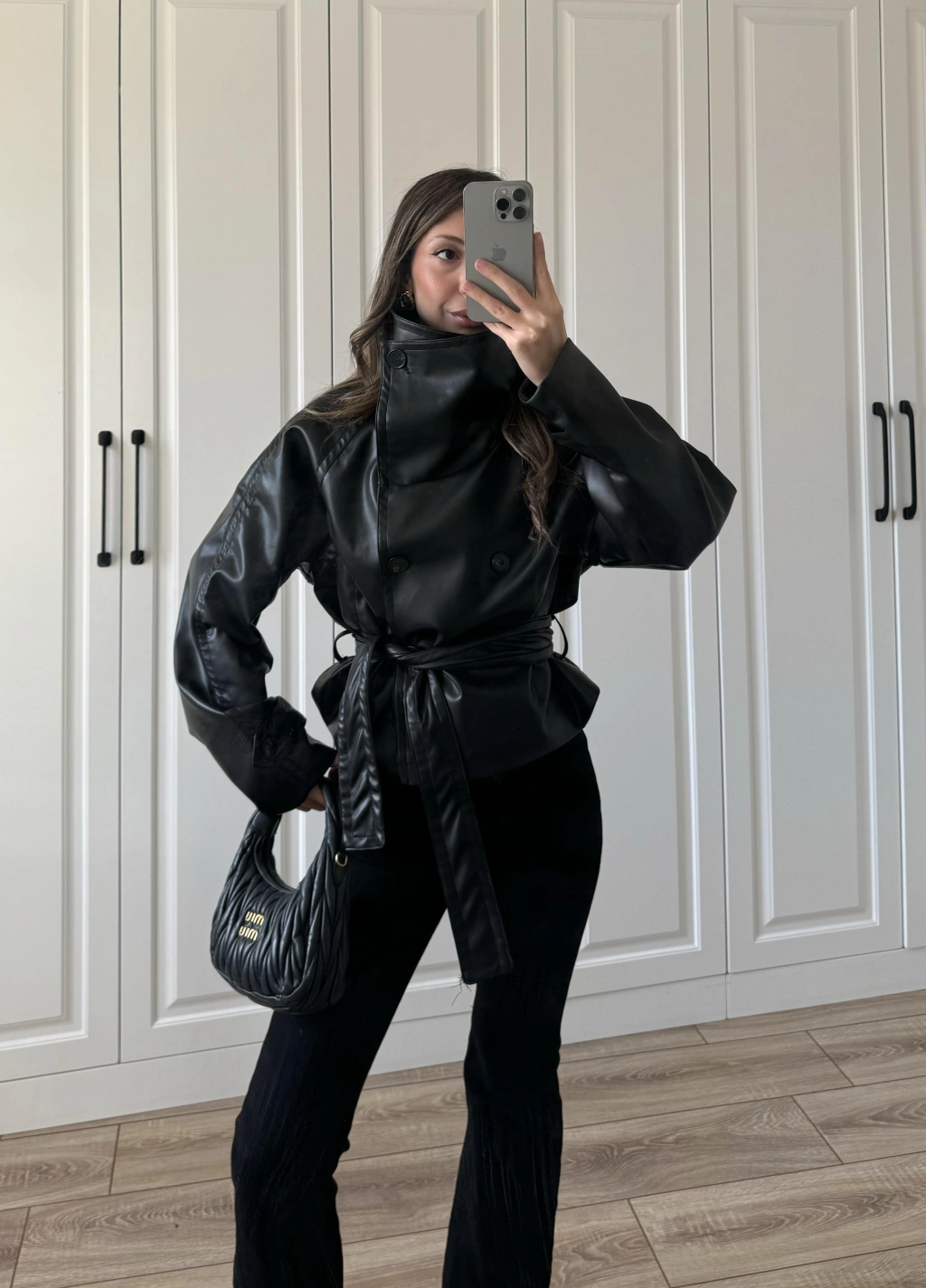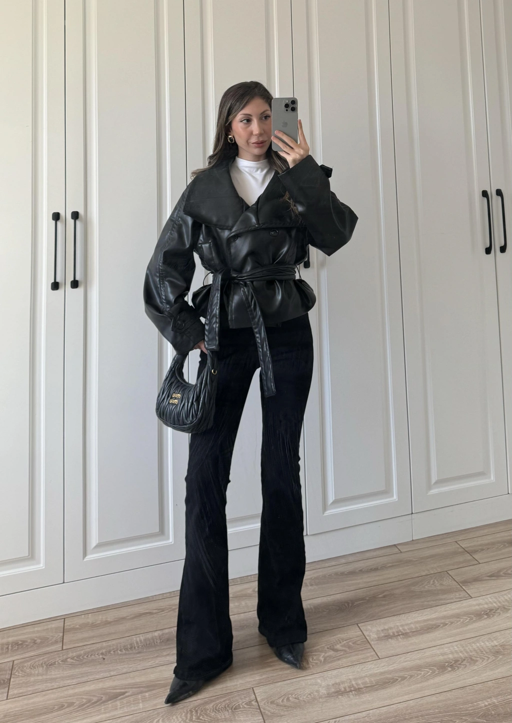 Kuşaklı Astarlı Siyah Kapitone Ceket