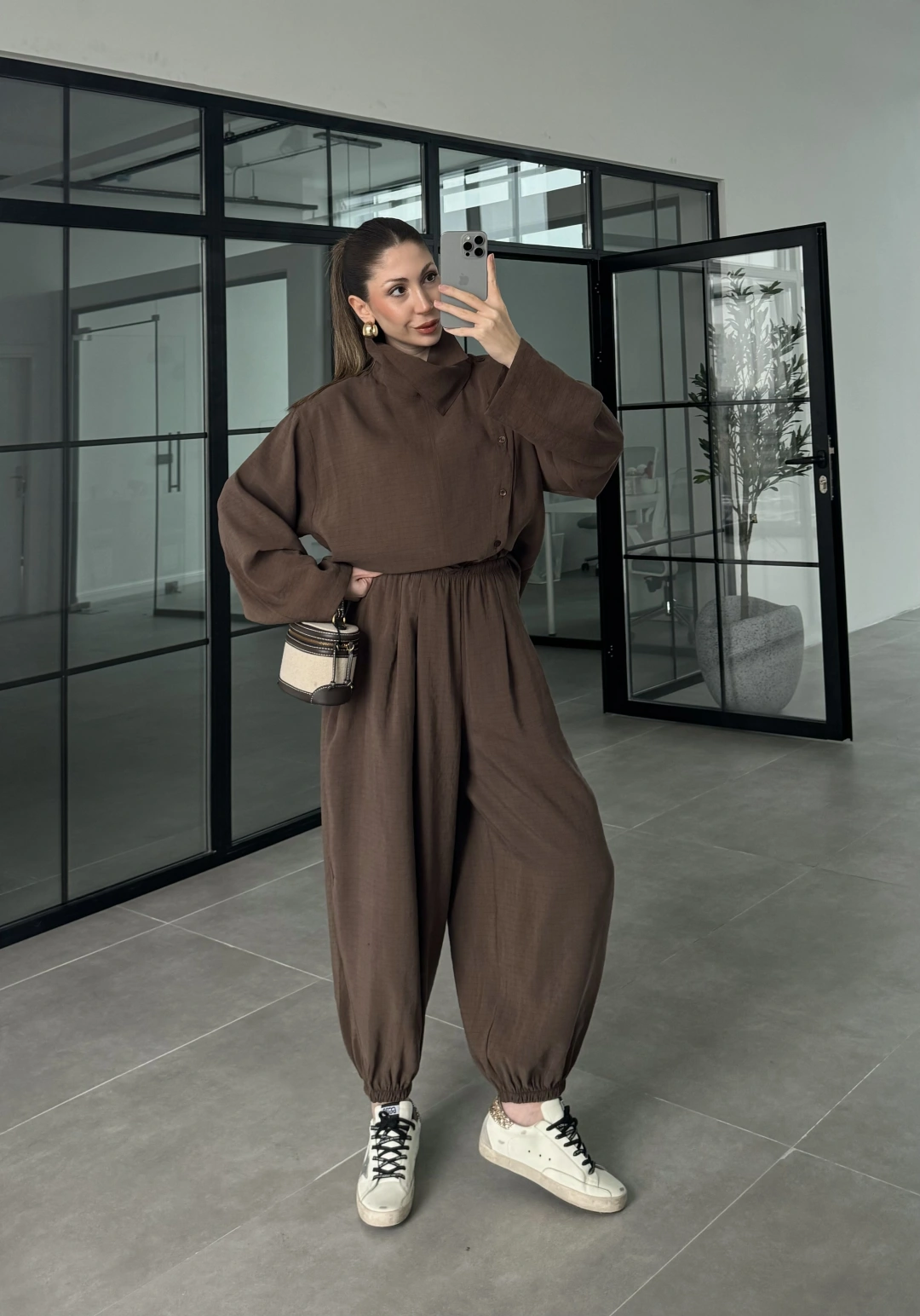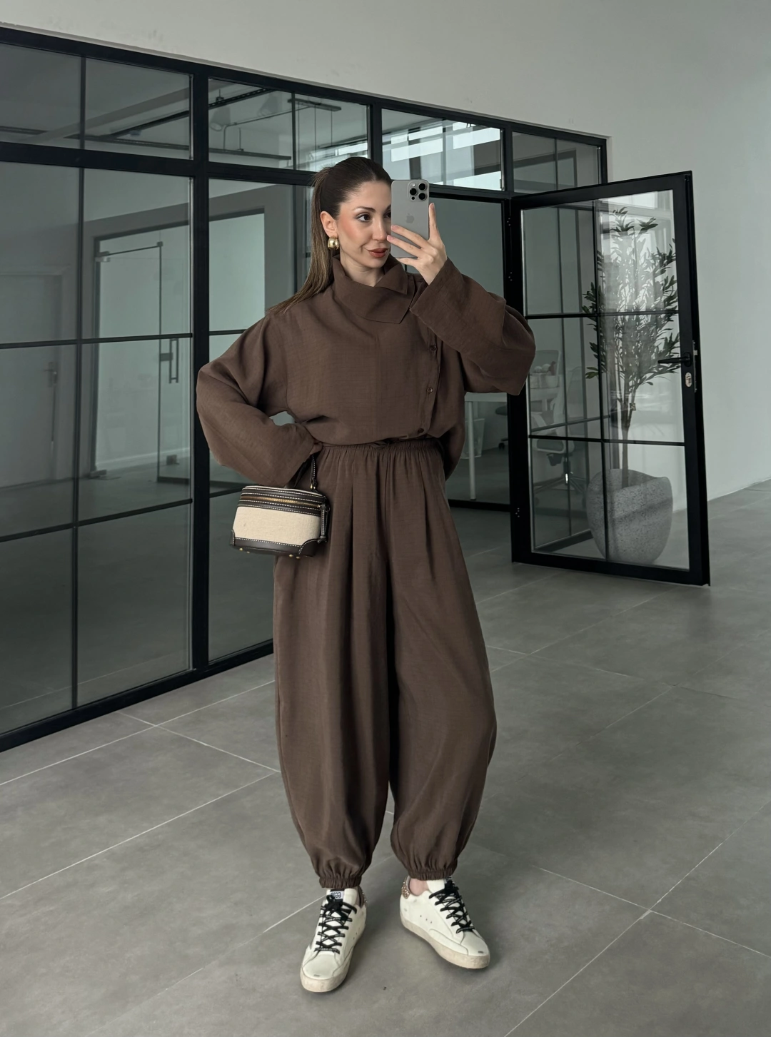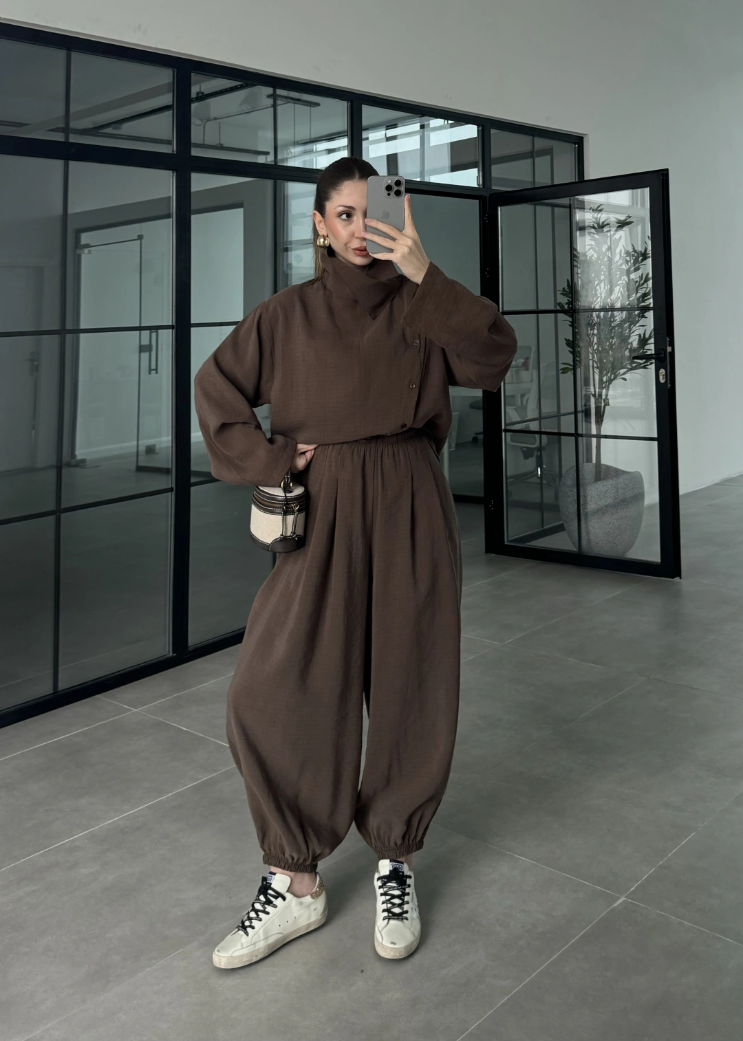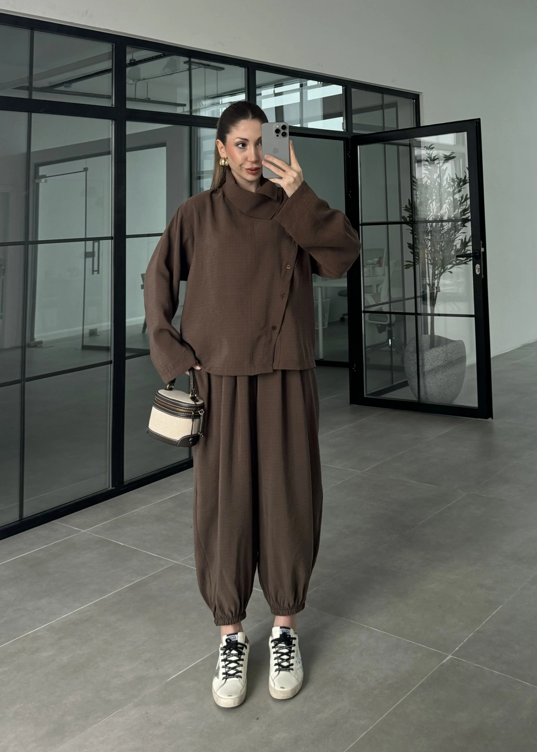 Yarasa Kol Oversize Çizgili Kahve Takım