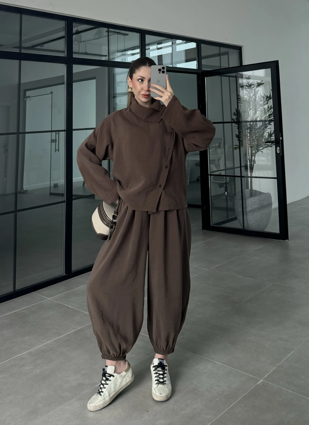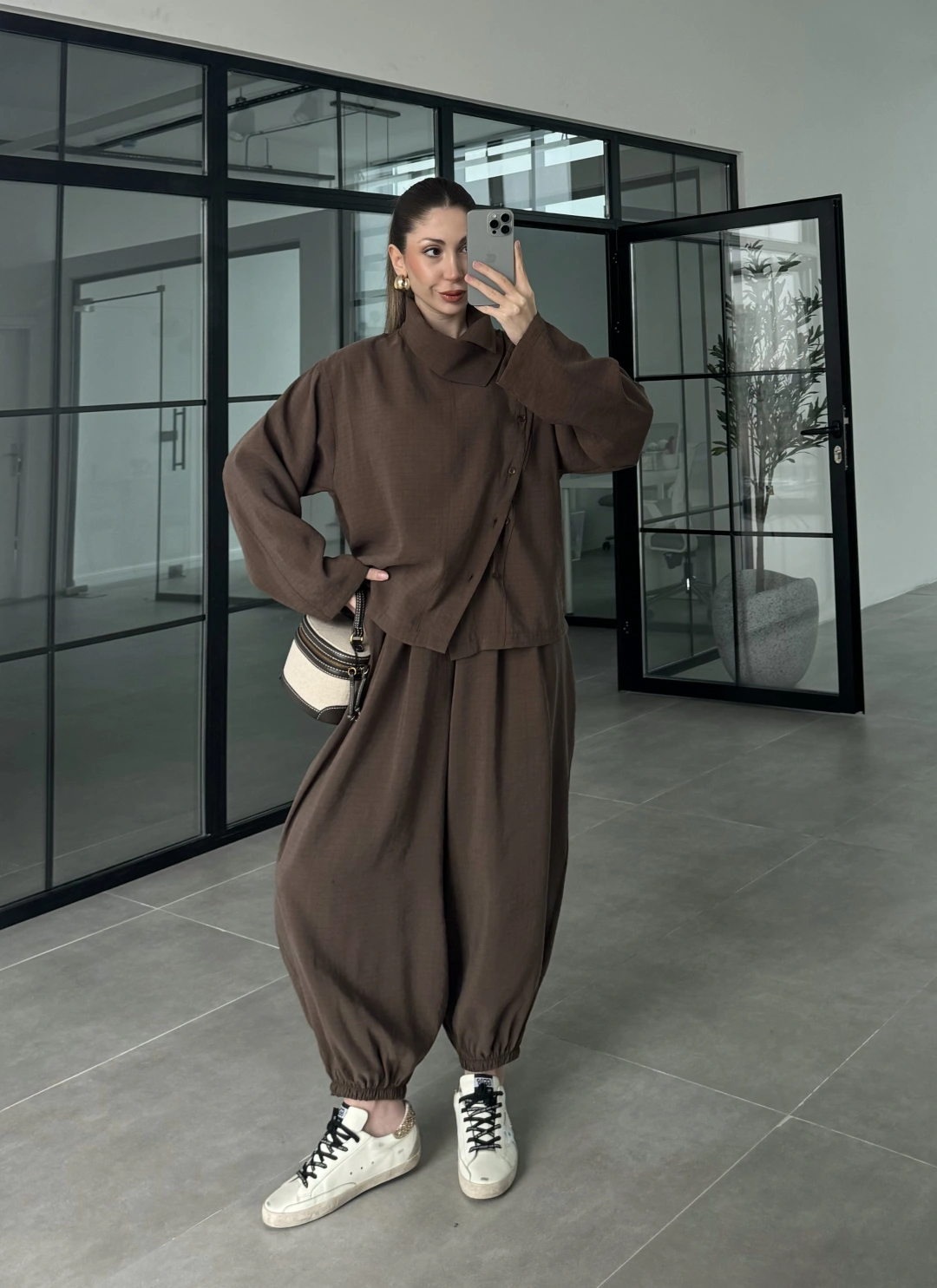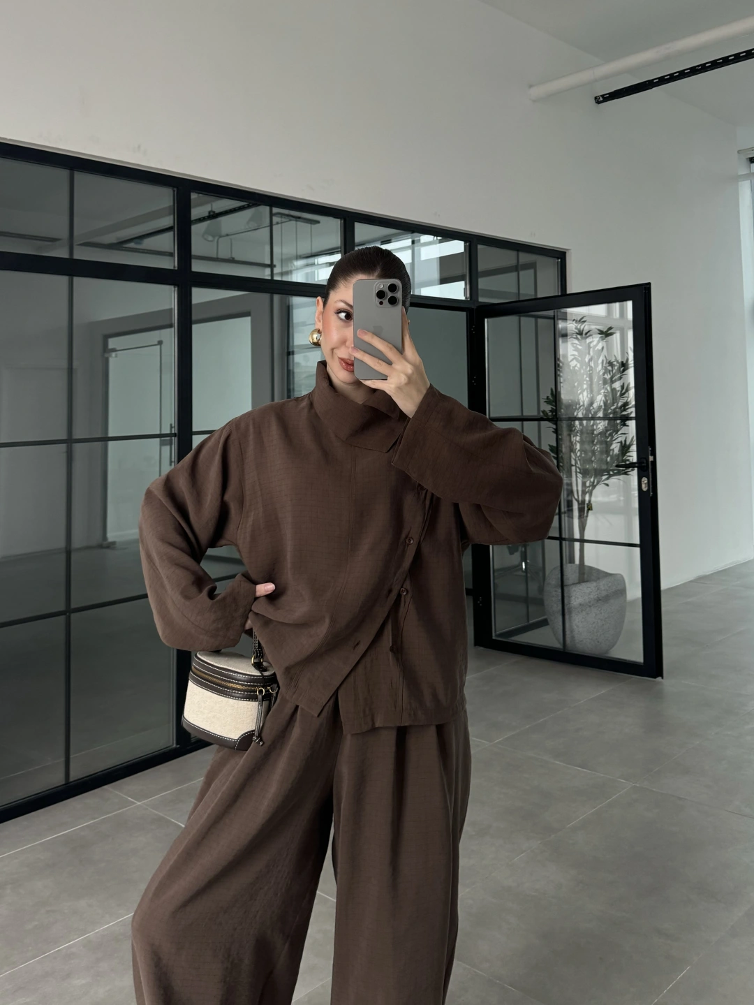 Dik Yaka Kare Desenli Tensel Kahve Şalvar Takım