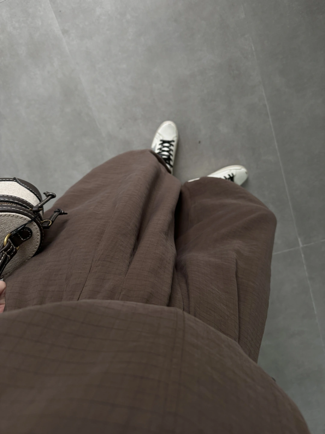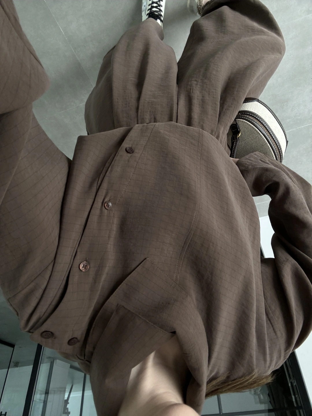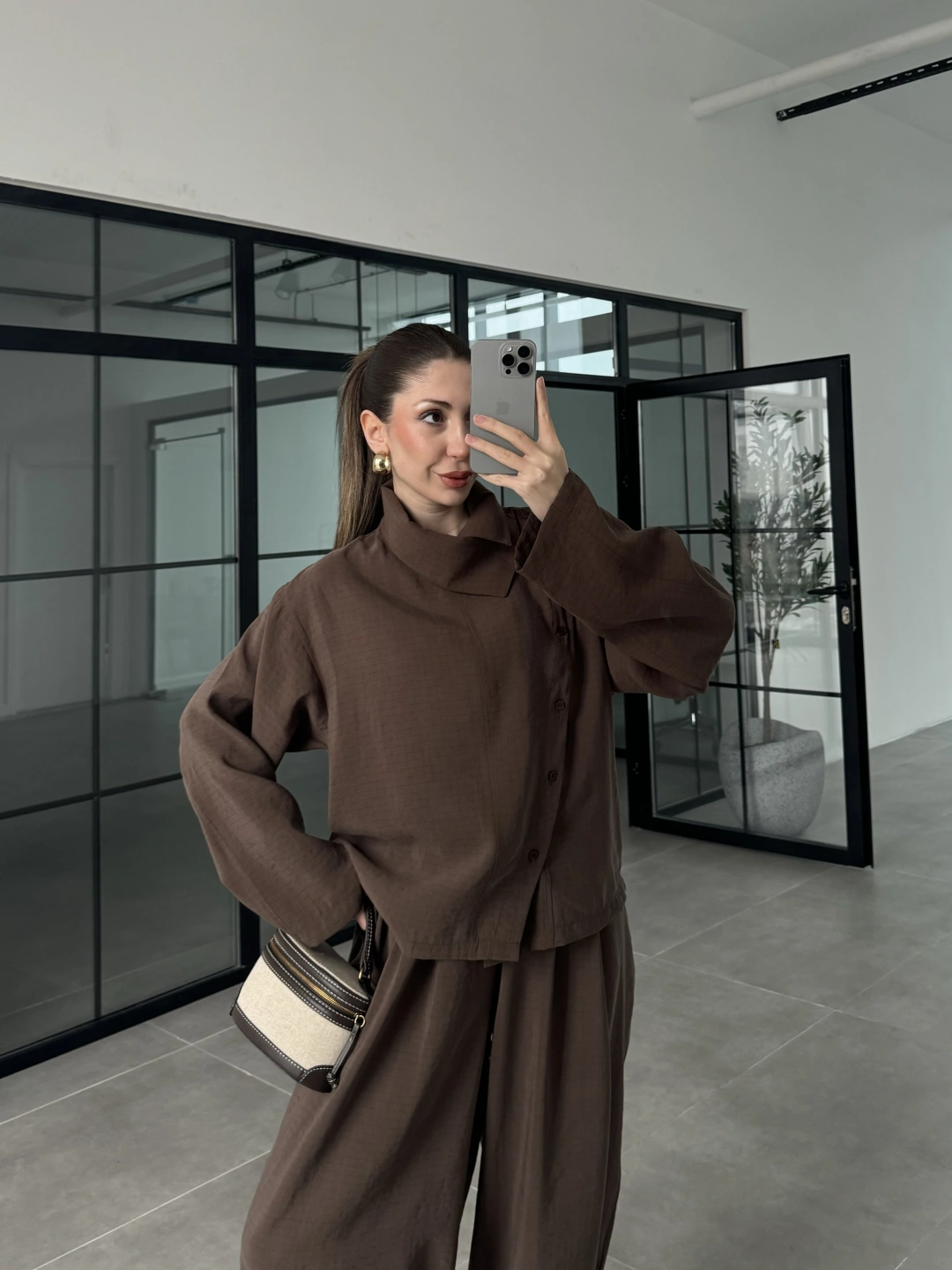 Dik Yaka Kare Desenli Tensel Kahve Şalvar Takım