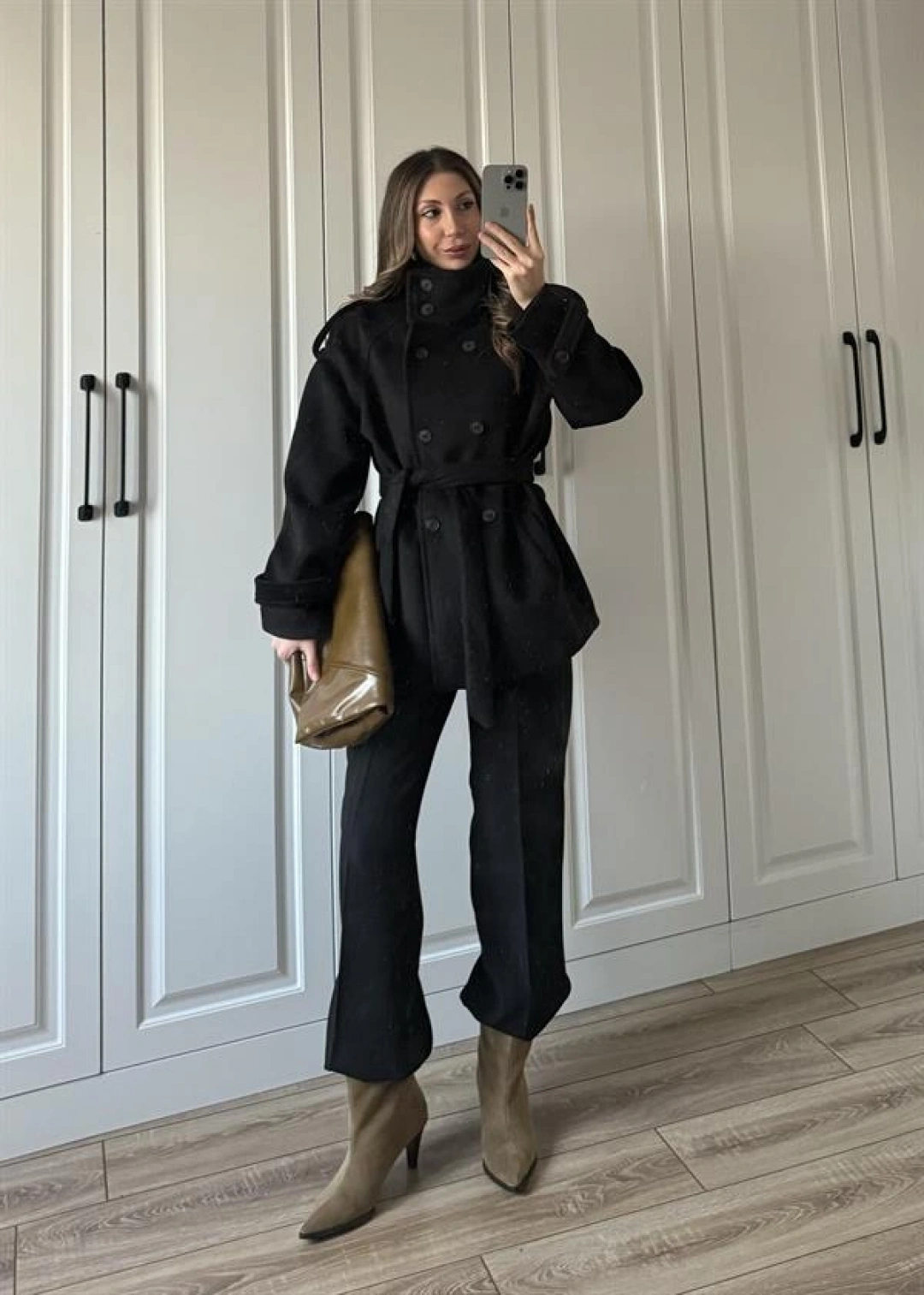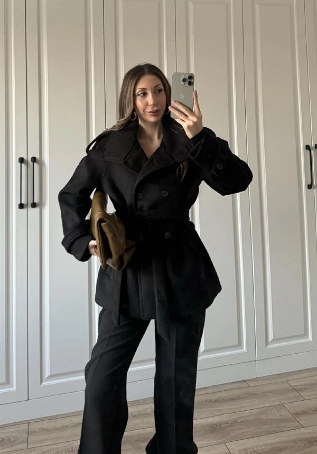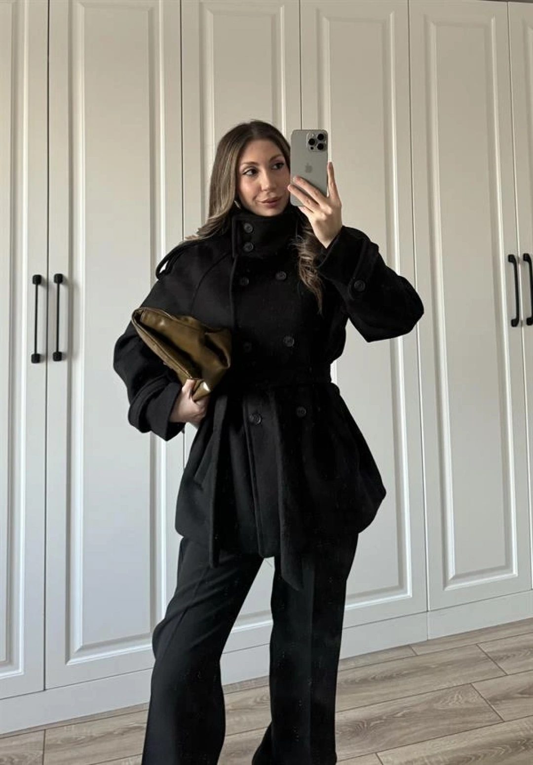 Dik Yaka Kruvaze Kuşaklı Siyah Yün Kaban
