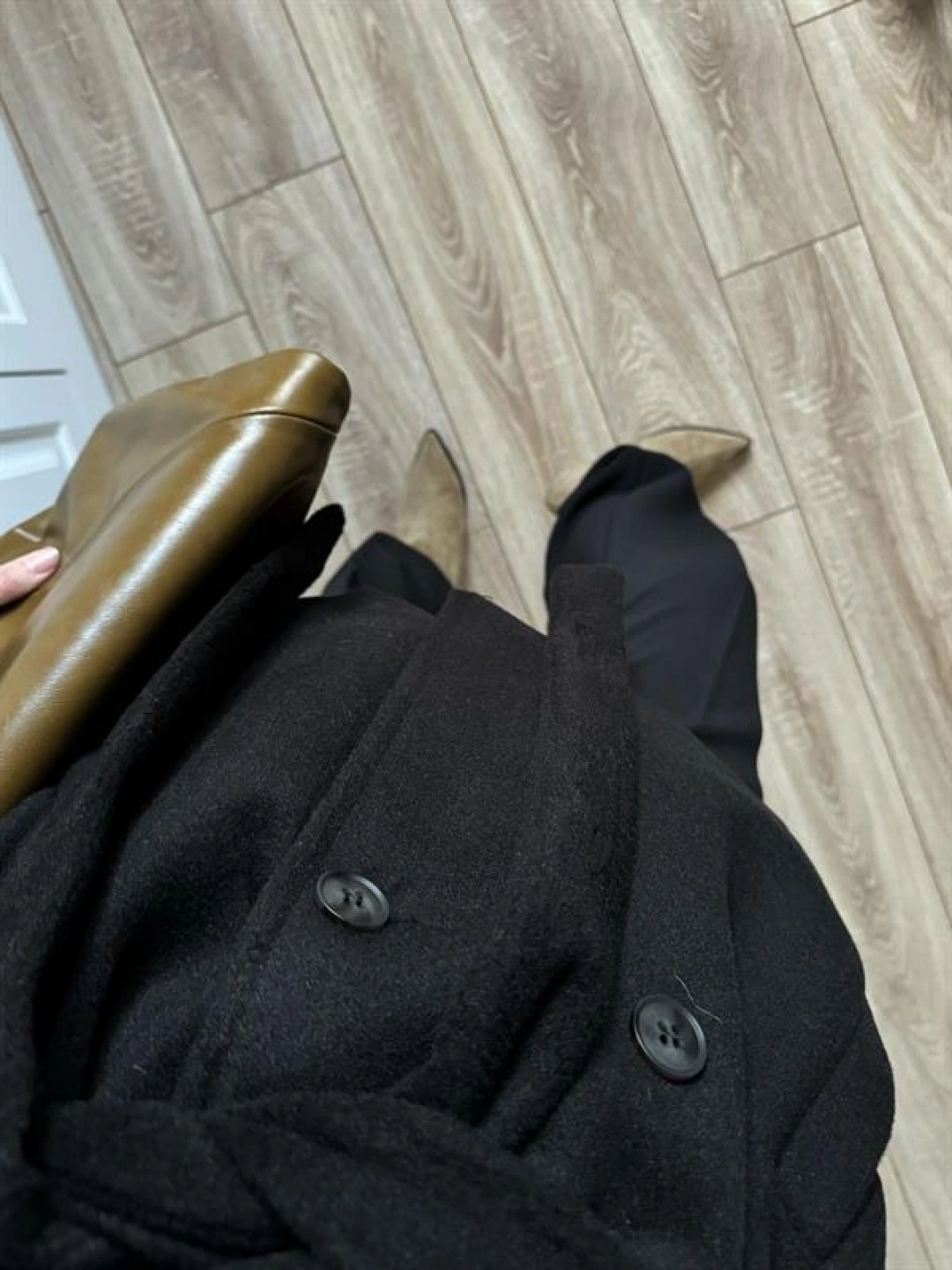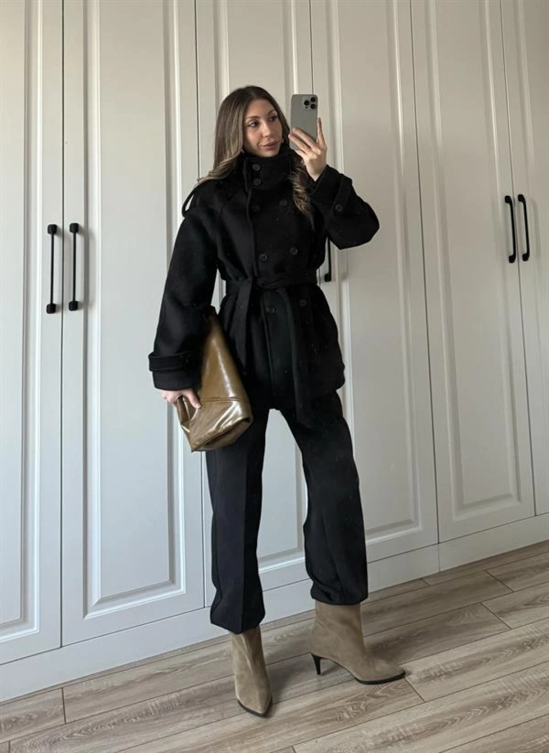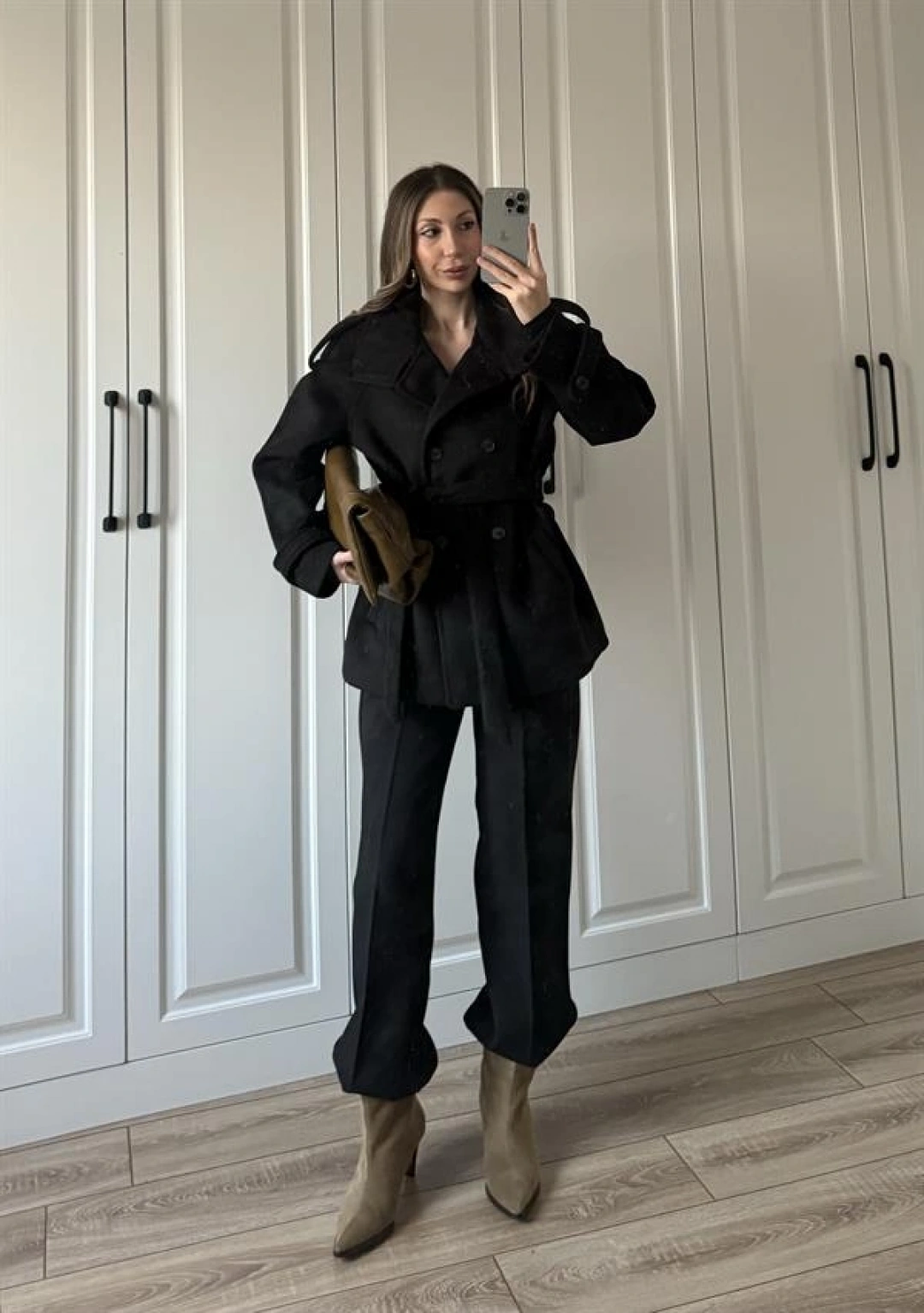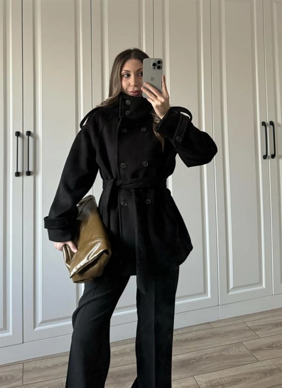 Dik Yaka Kruvaze Kuşaklı Siyah Yün Kaban