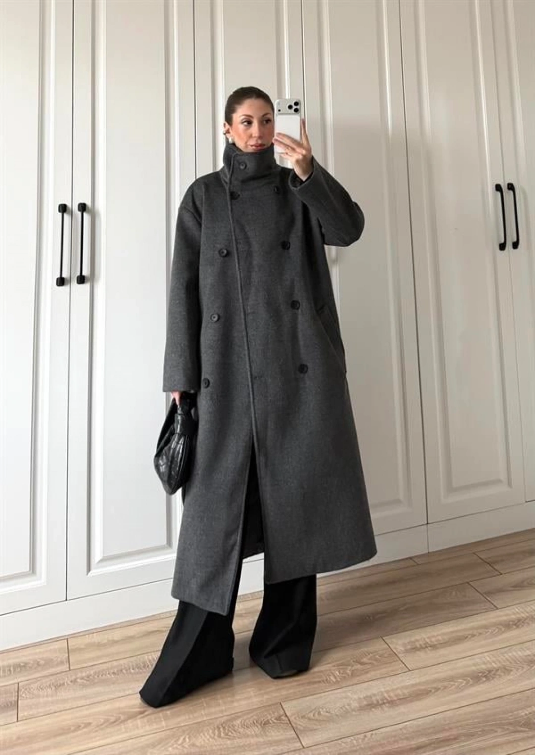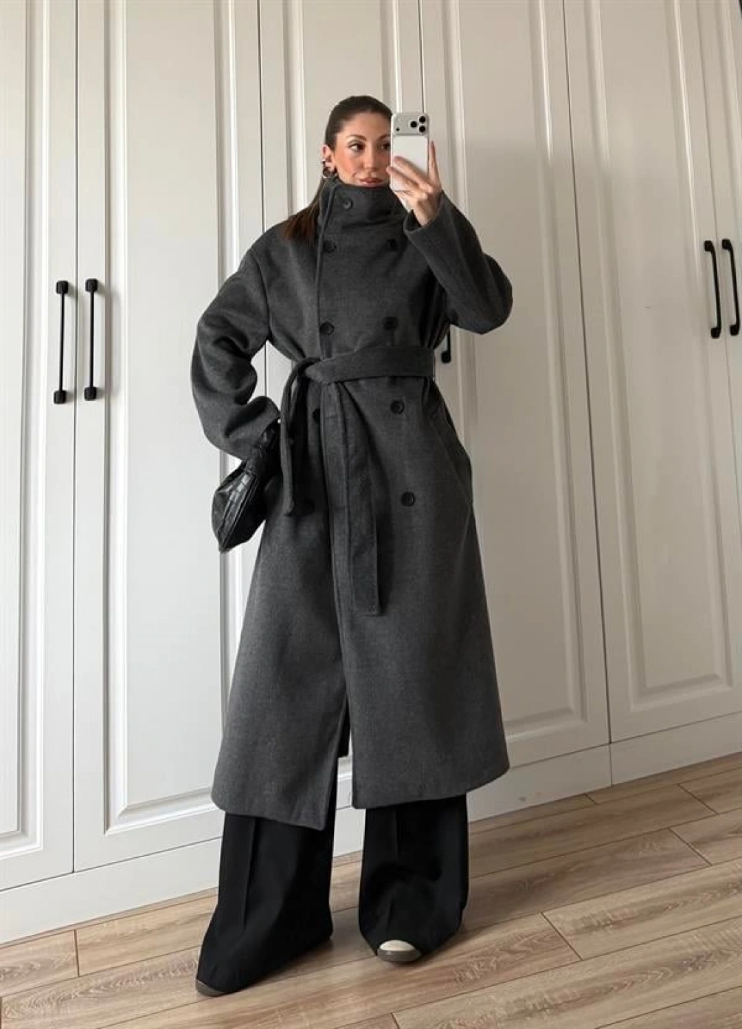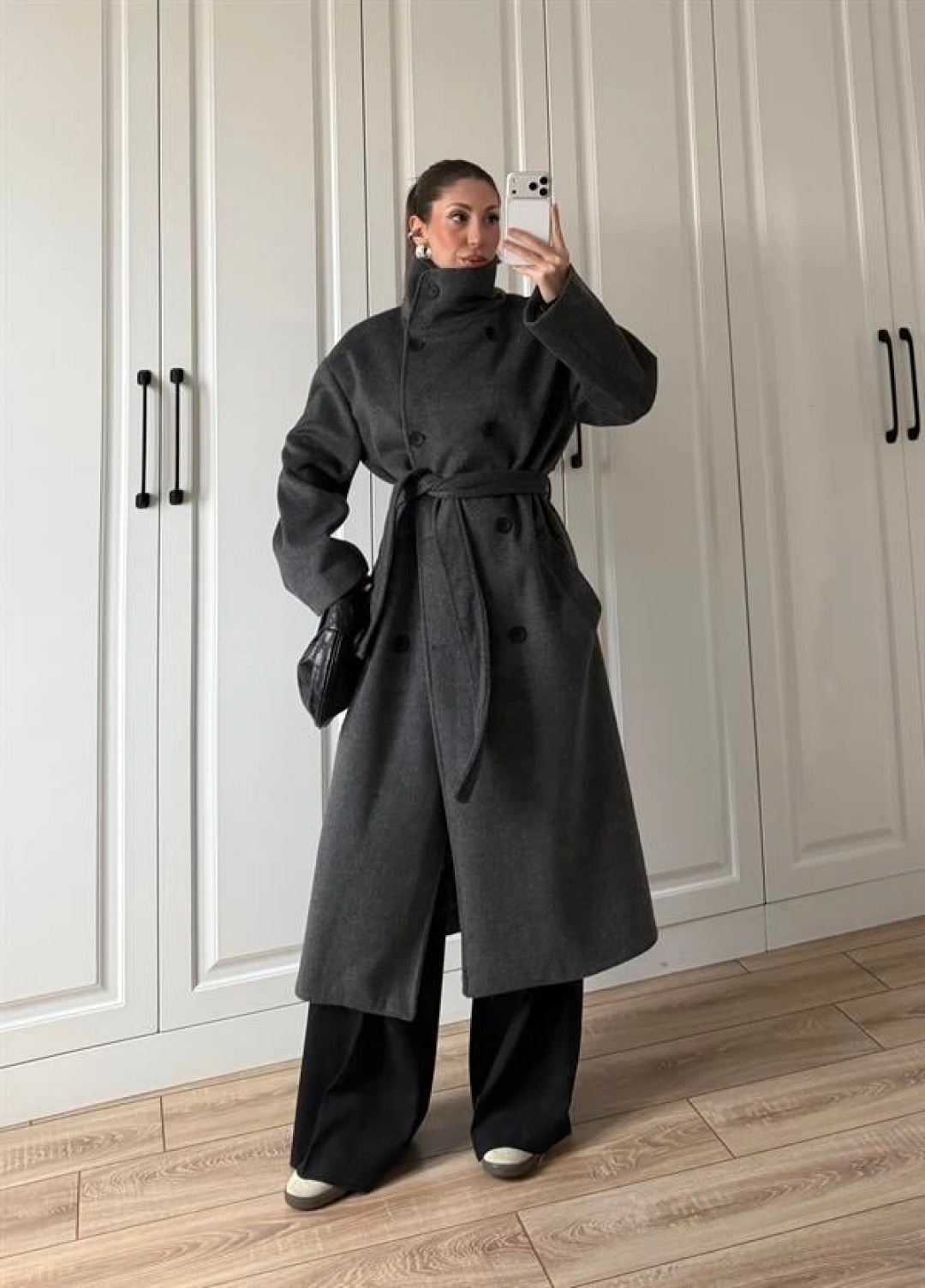 Dik Yaka Kuşaklı Antrasit Yün Kaban