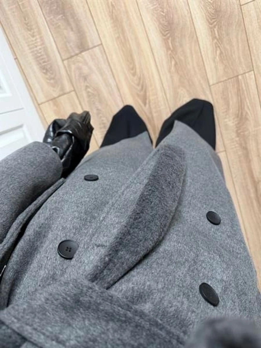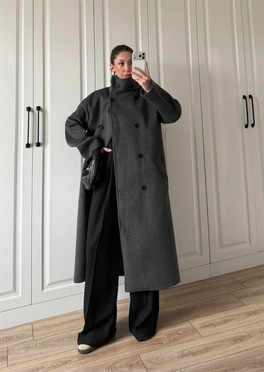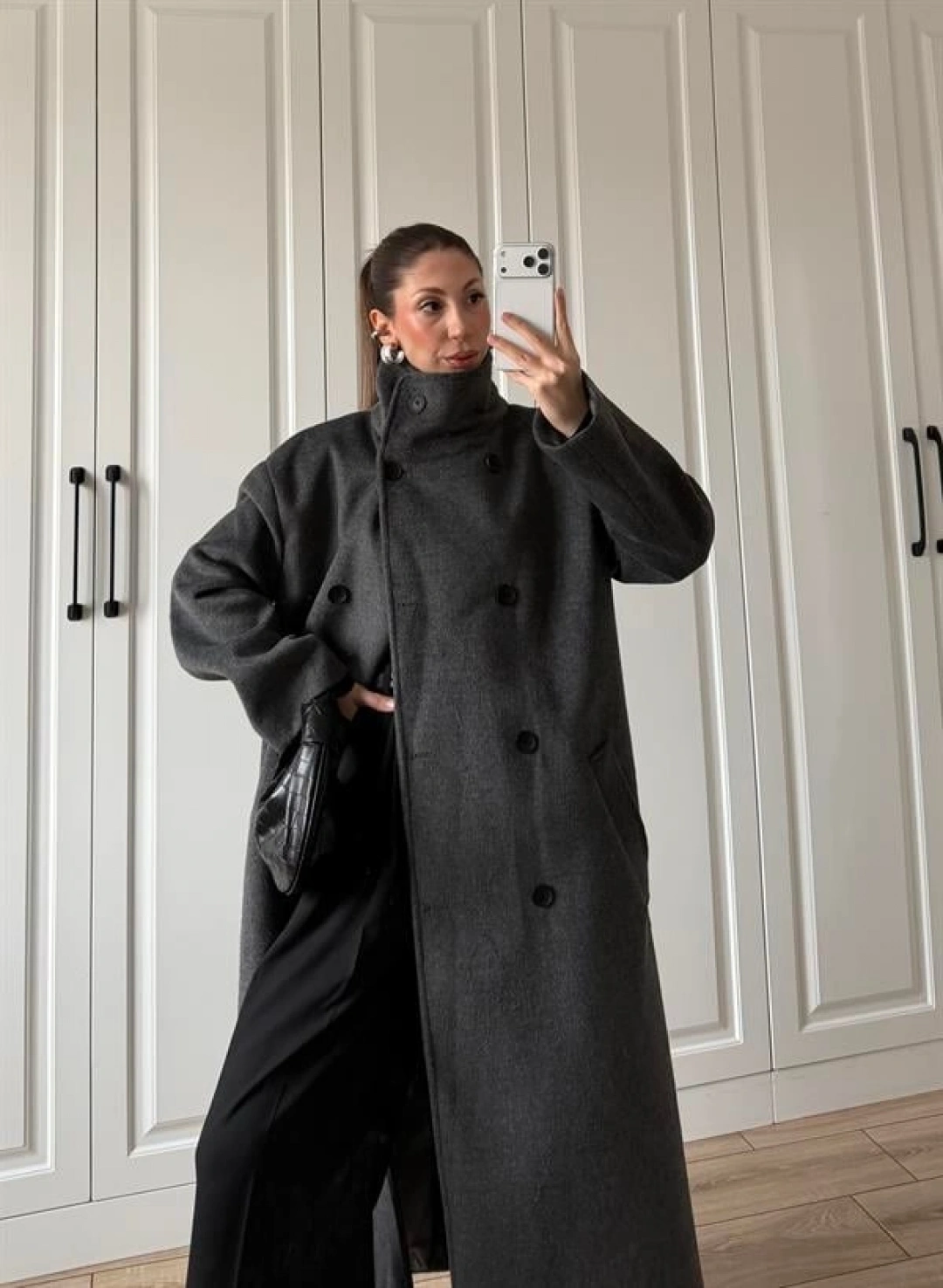 Dik Yaka Kuşaklı Antrasit Yün Kaban