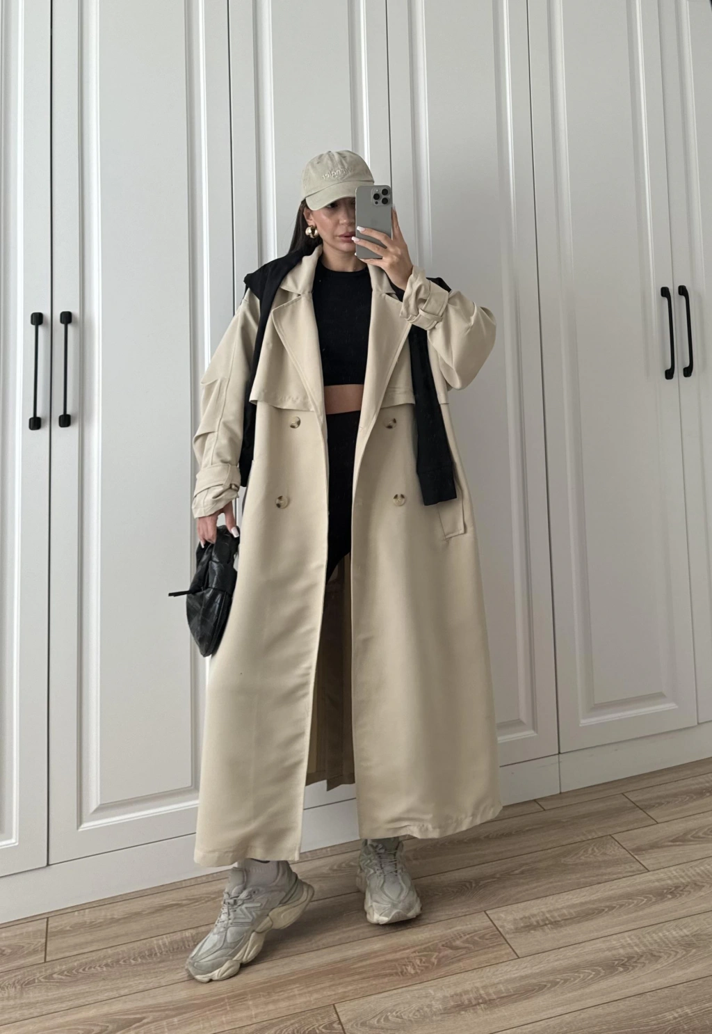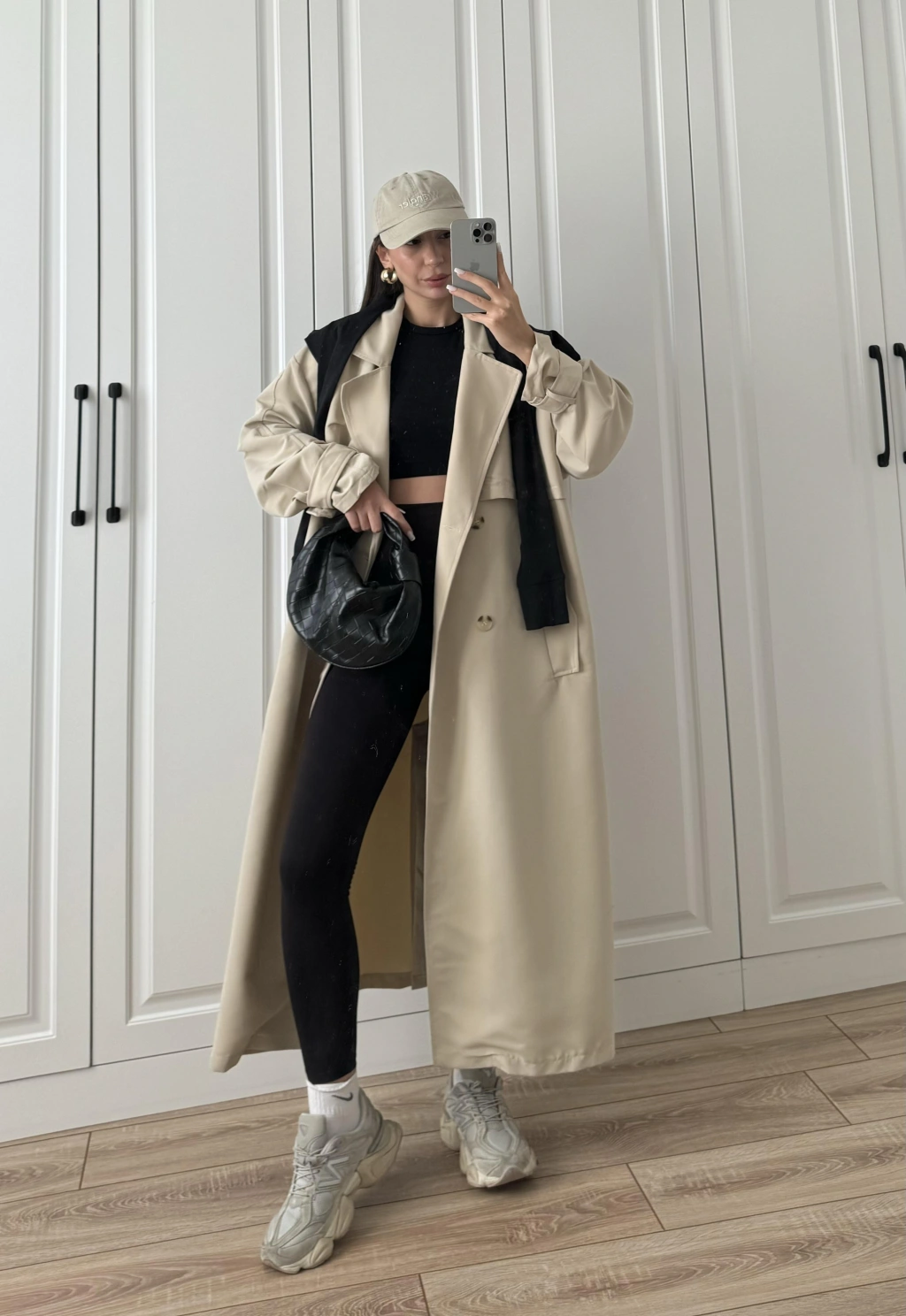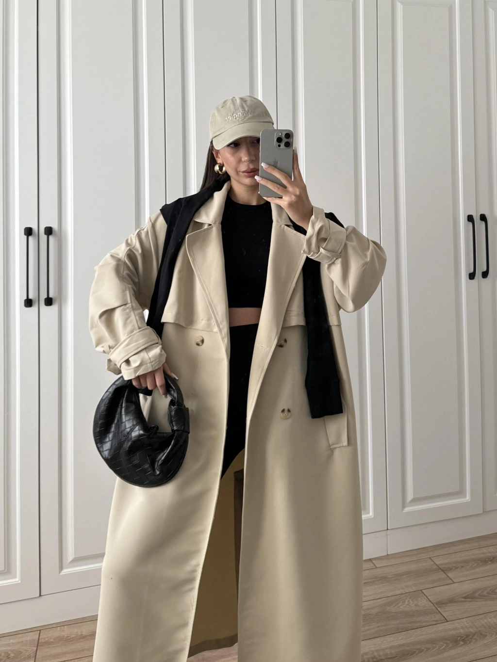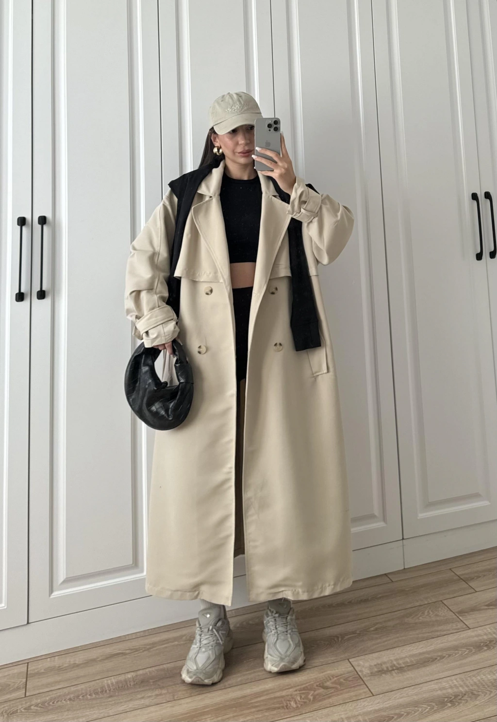 Poem Kuşaklı Astarlı Oversize Bej Trençkot