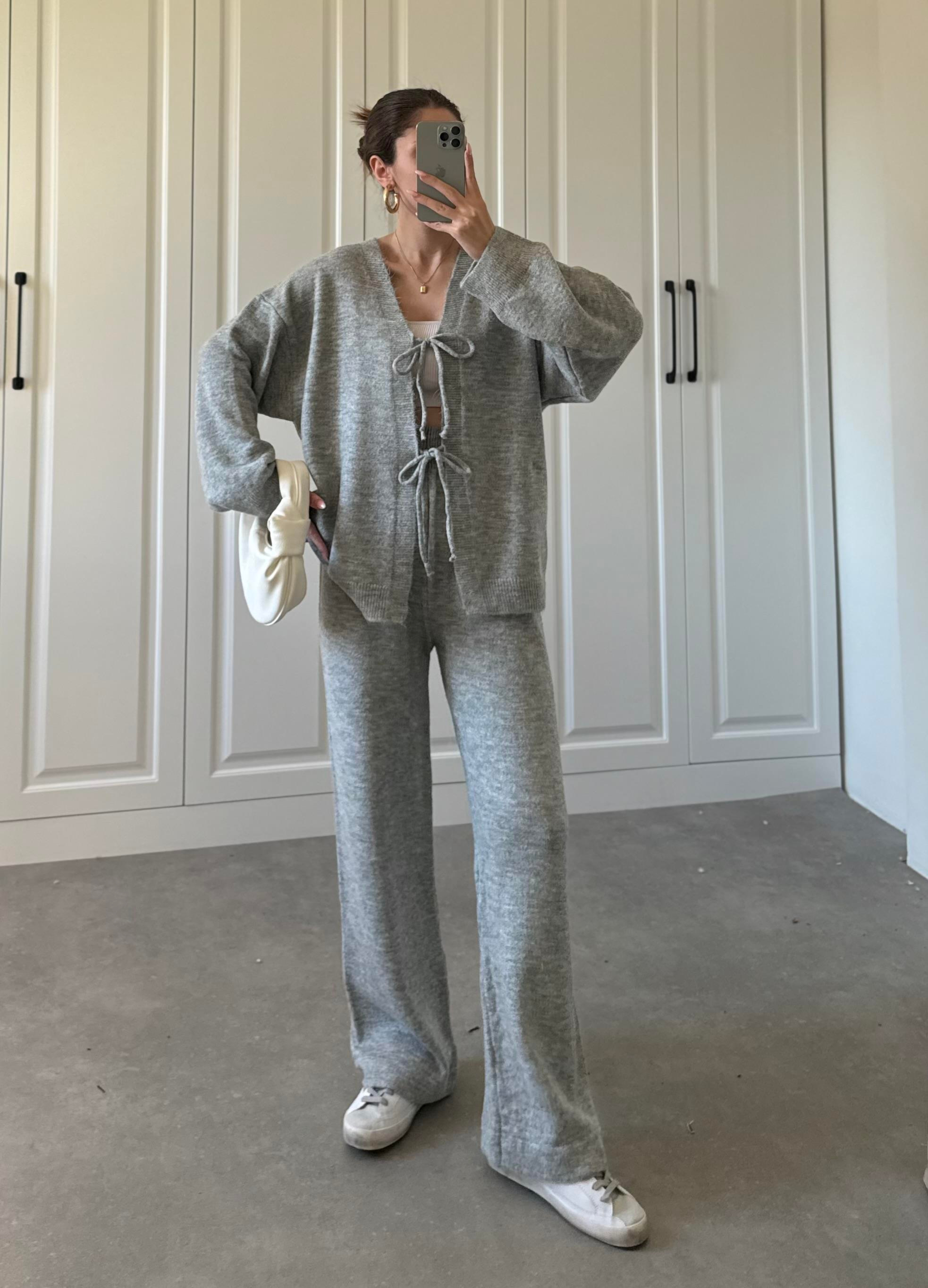 Esa Önü Bağlamalı Gri Triko Hırka Takım
