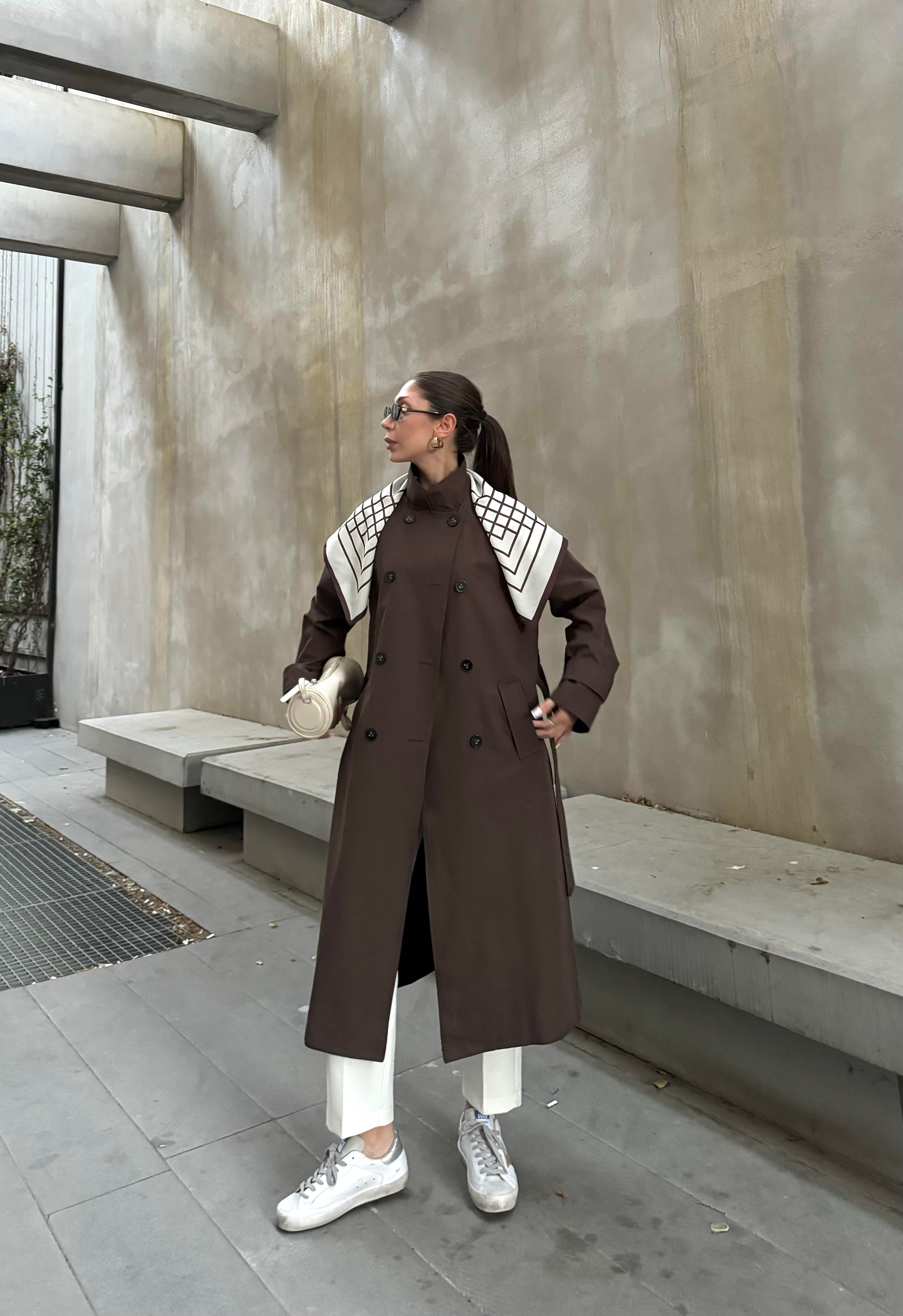 Fularlı Oversize Premium Kahve Trençkot