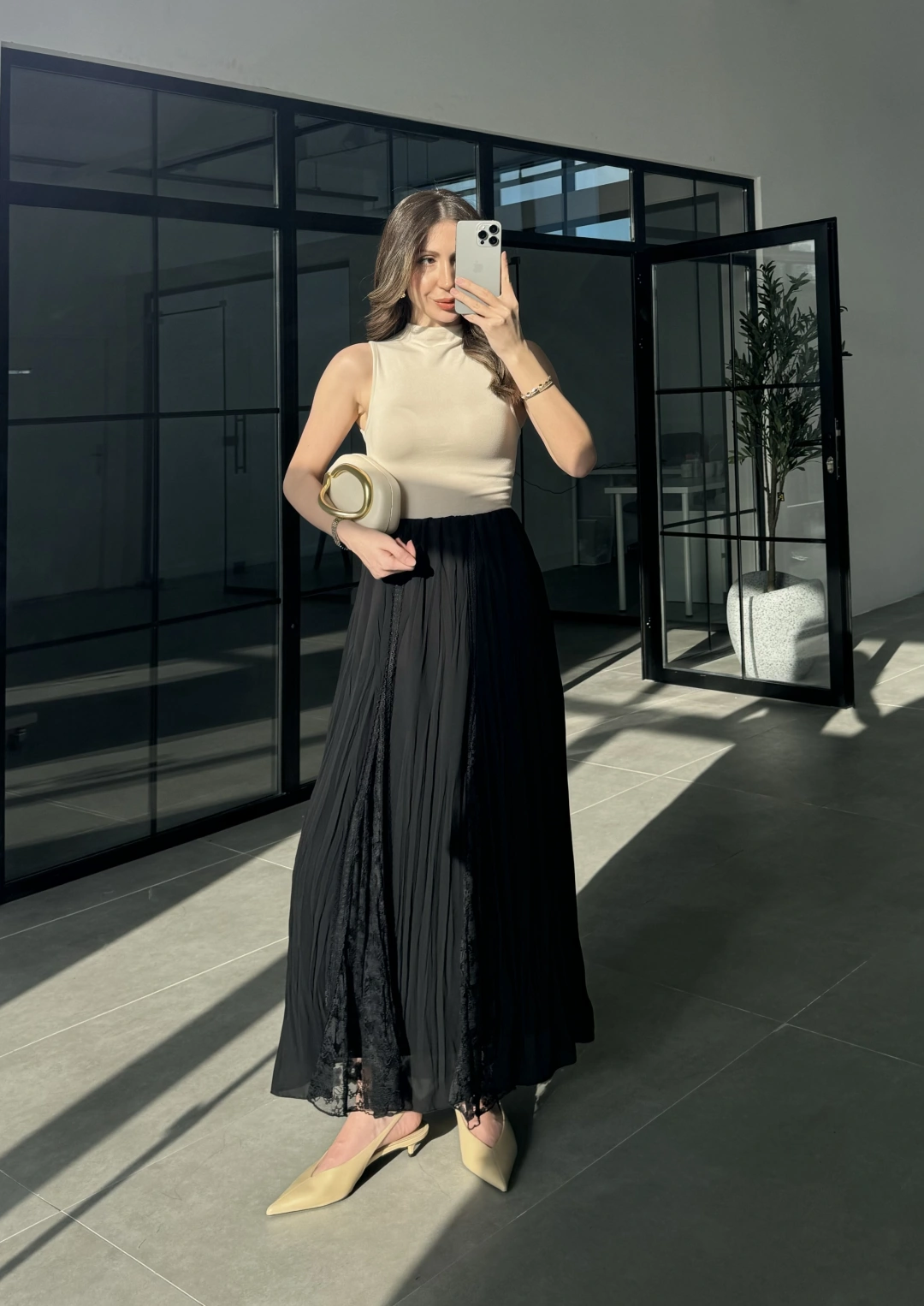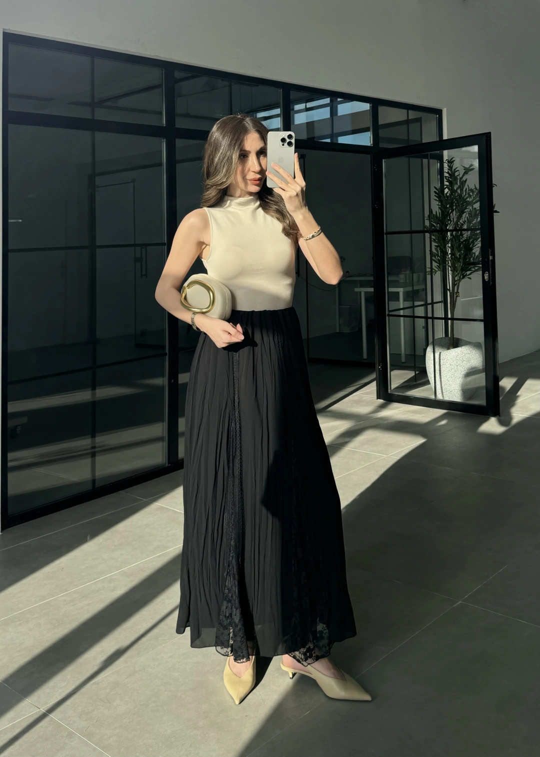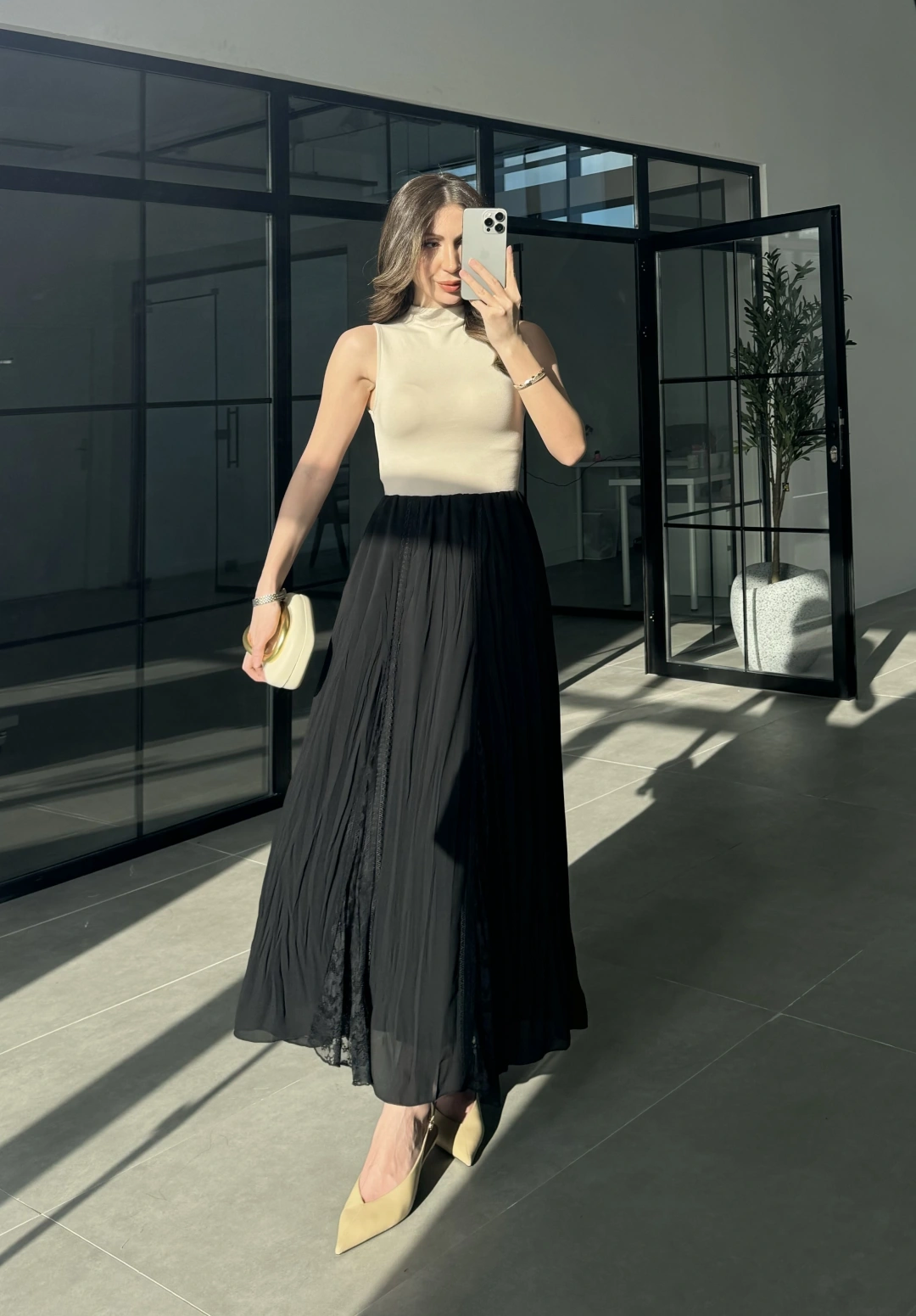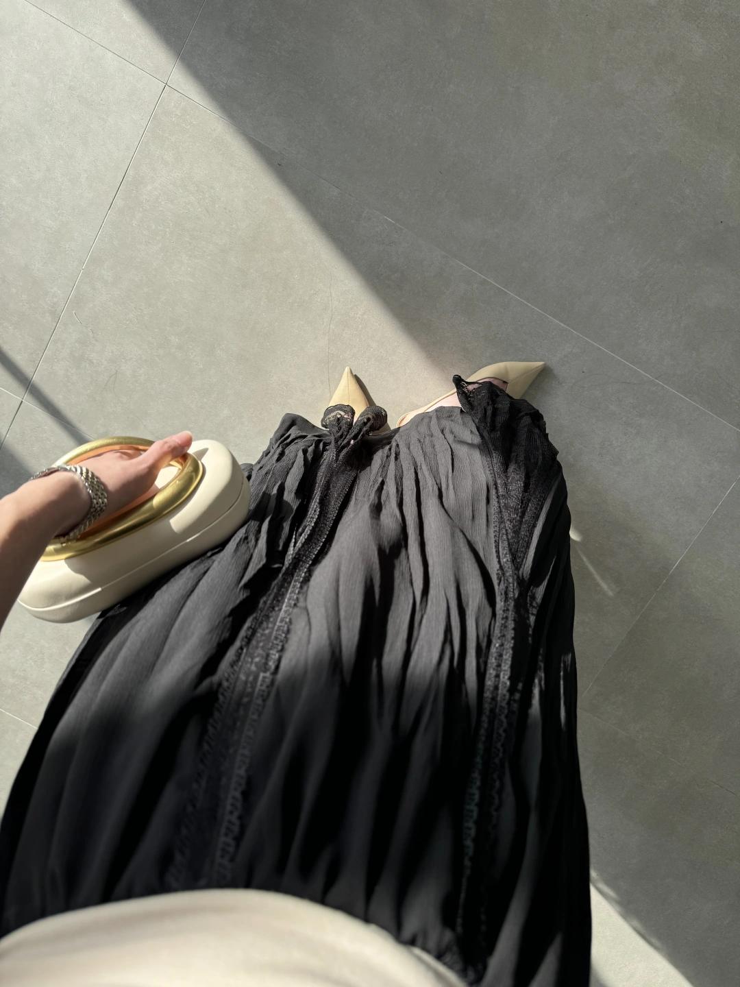 Beli Lastikli Siyah Tensel Kırışık Etek