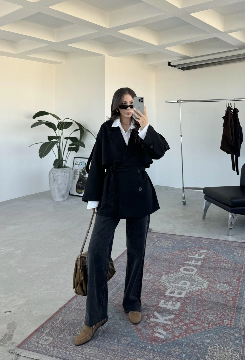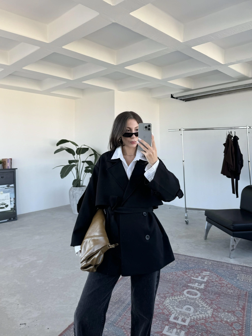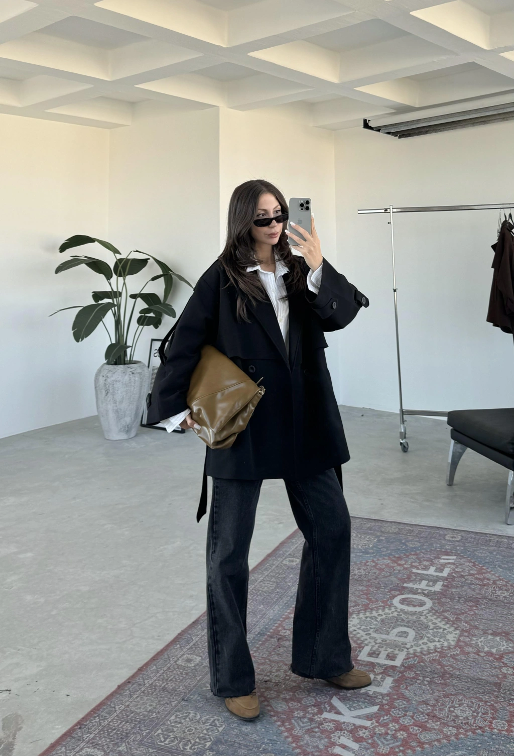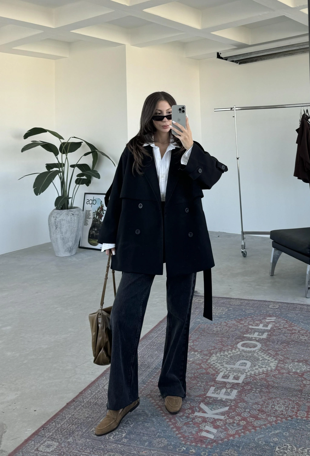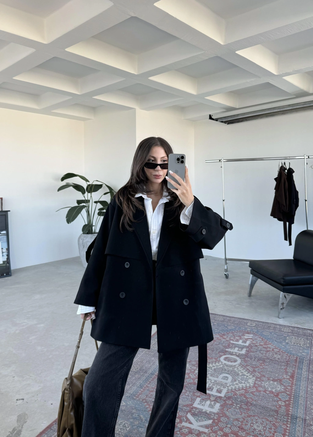 Poem Kuşaklı Astarlı Oversize Siyah Trençkot