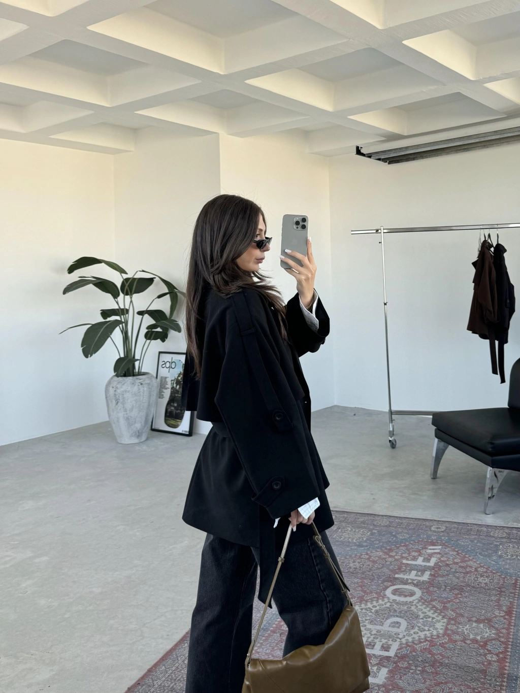 Aria Kuşaklı Astarlı Premium Siyah Trençkot