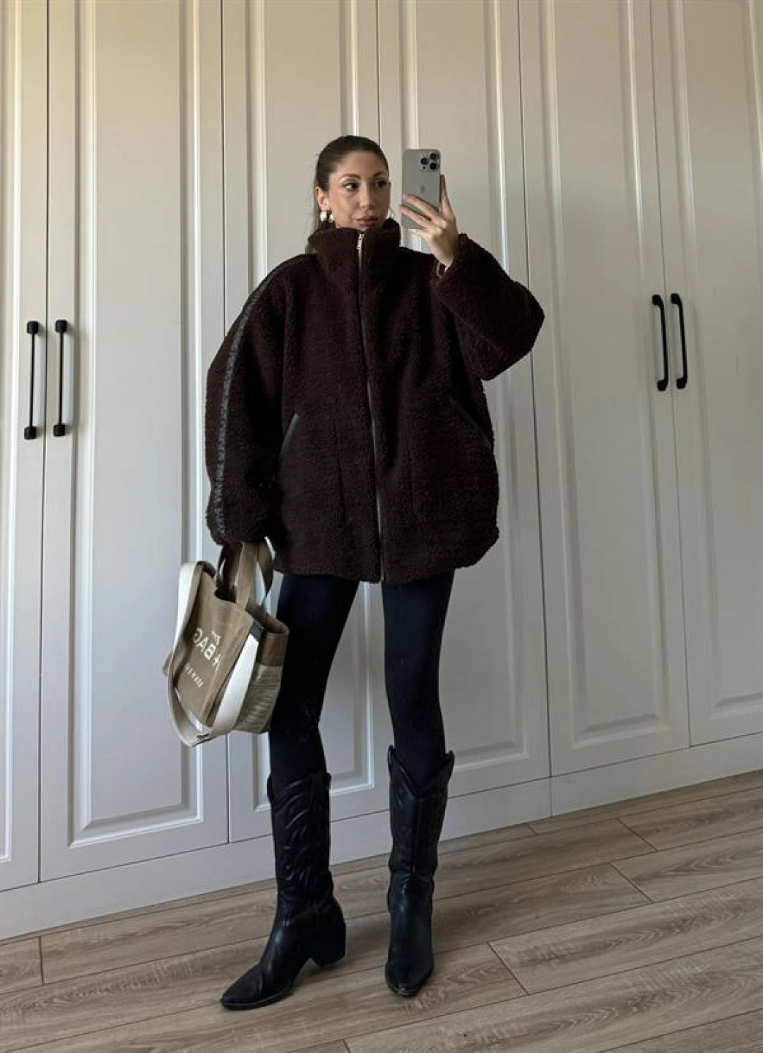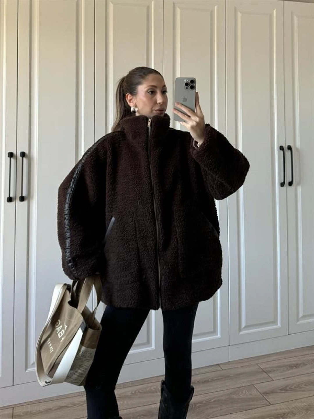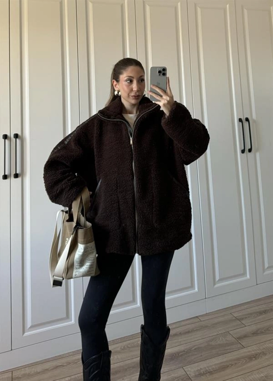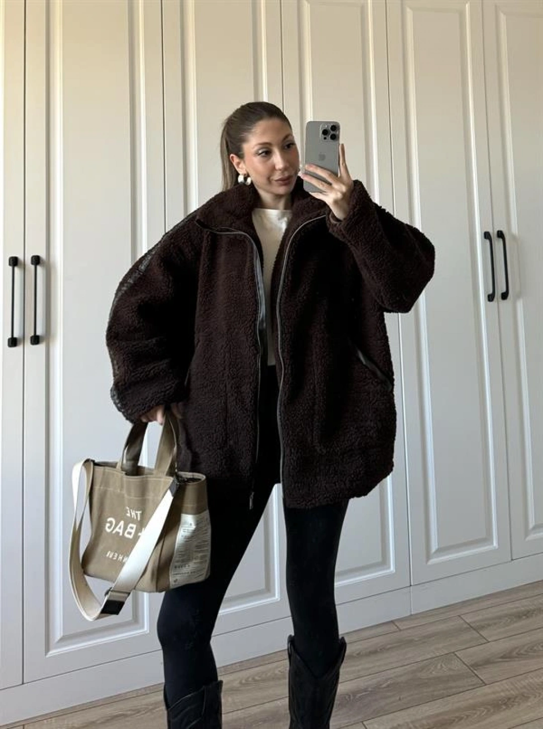 Koza Oversize Astarlı Premium Kahve Peluş Ceket