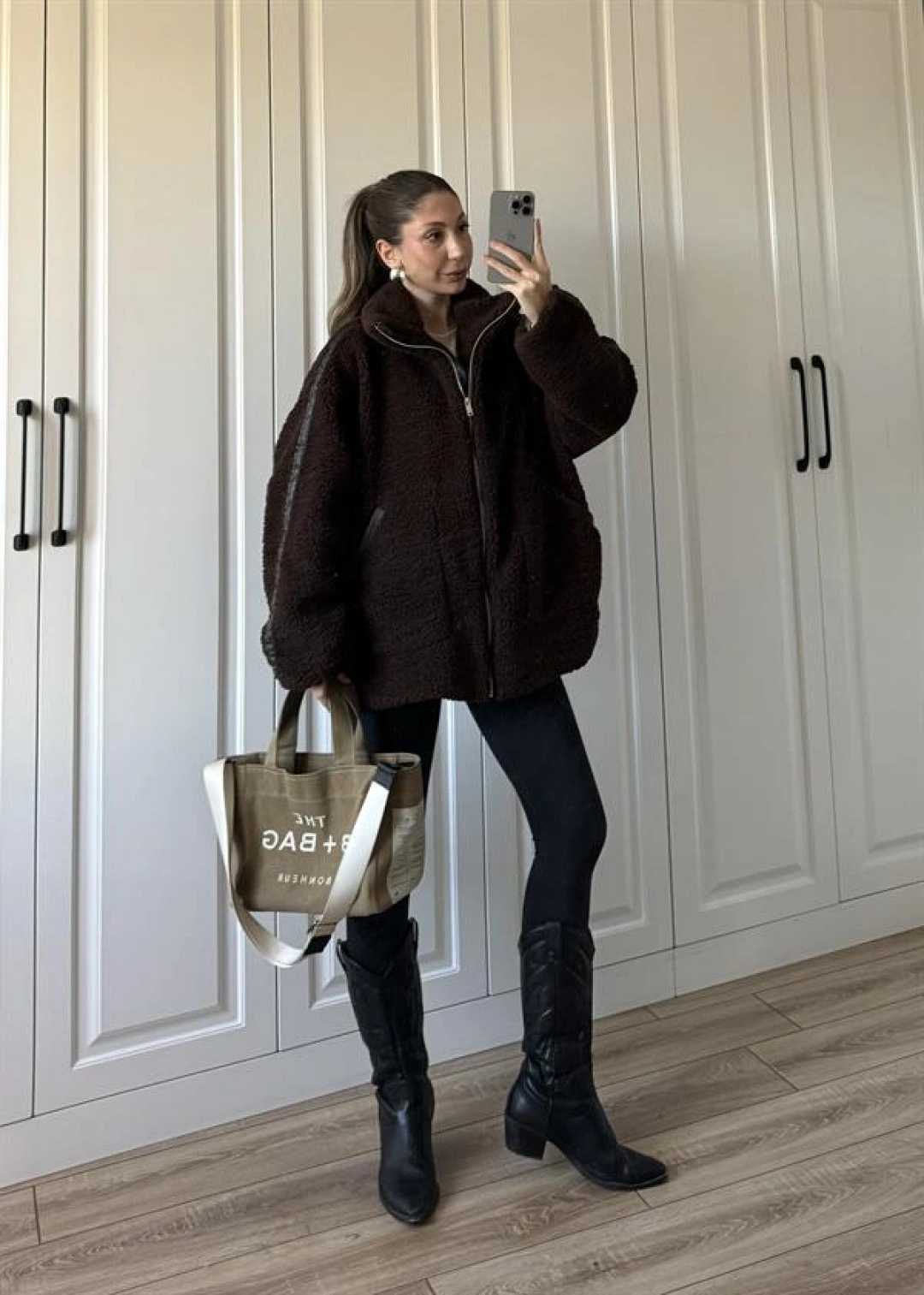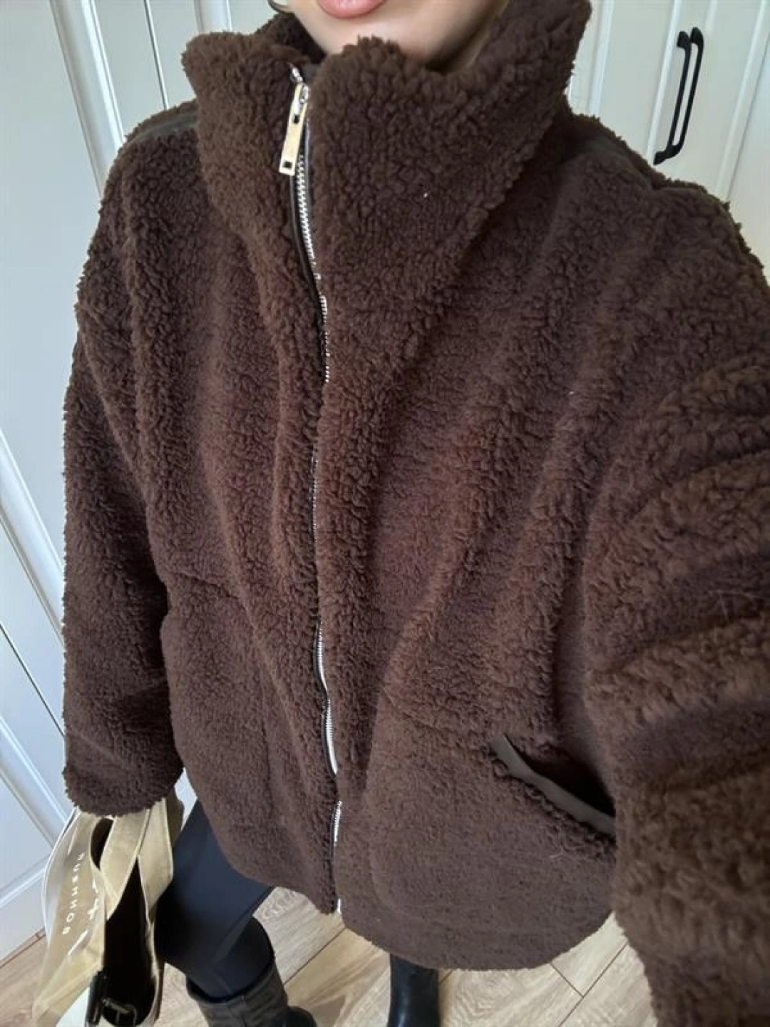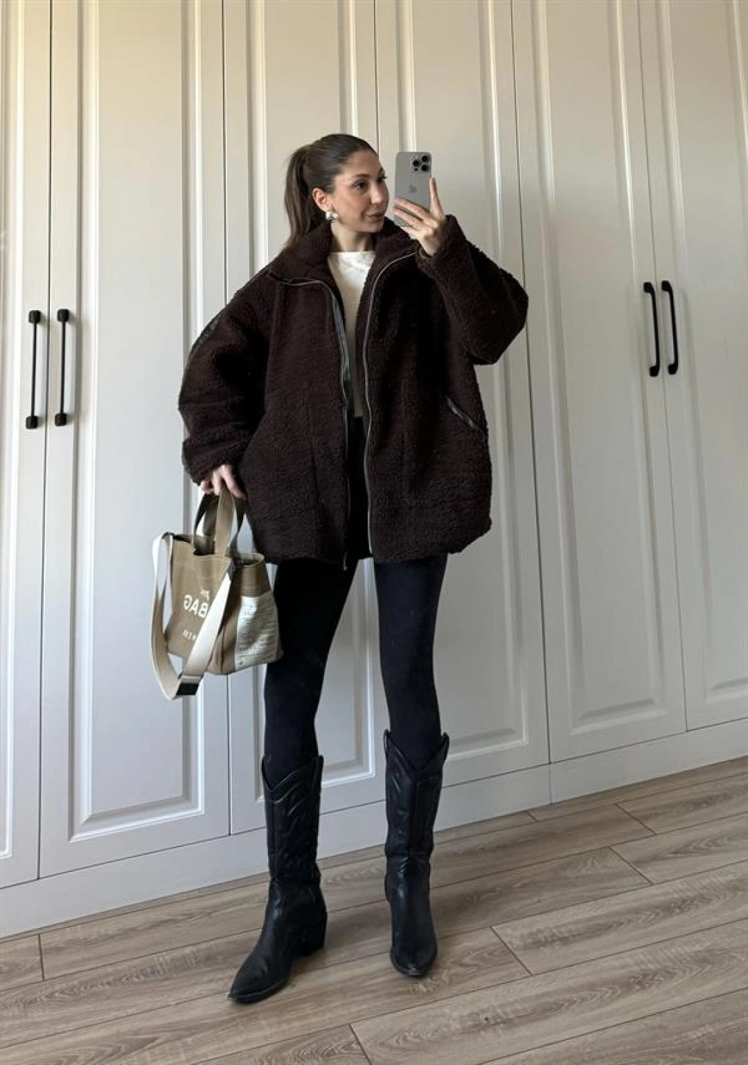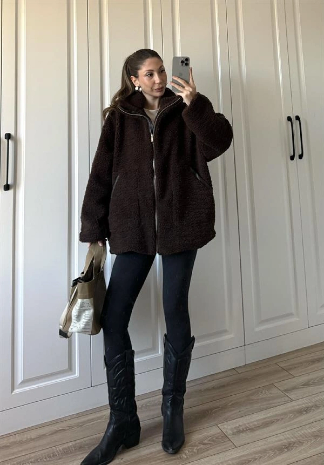 Koza Oversize Astarlı Premium Kahve Peluş Ceket