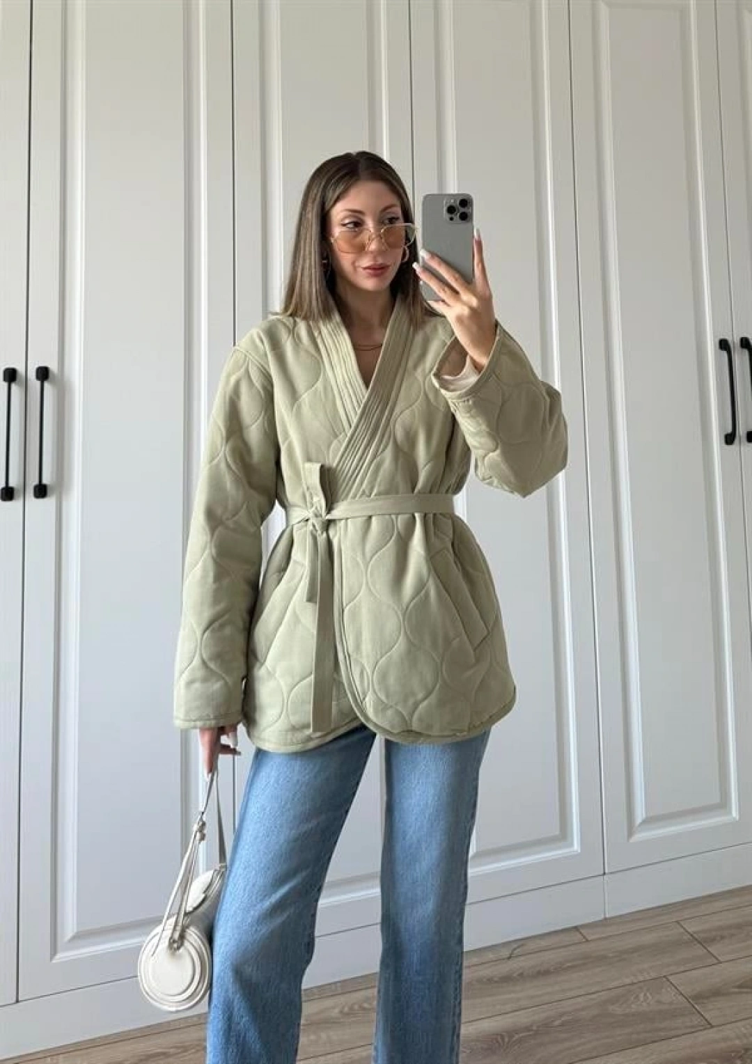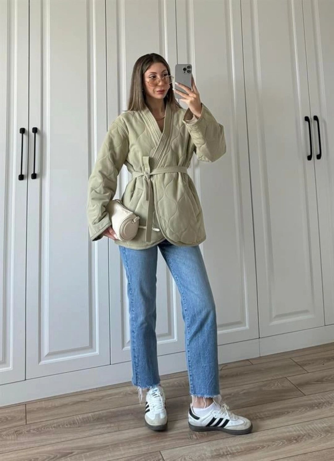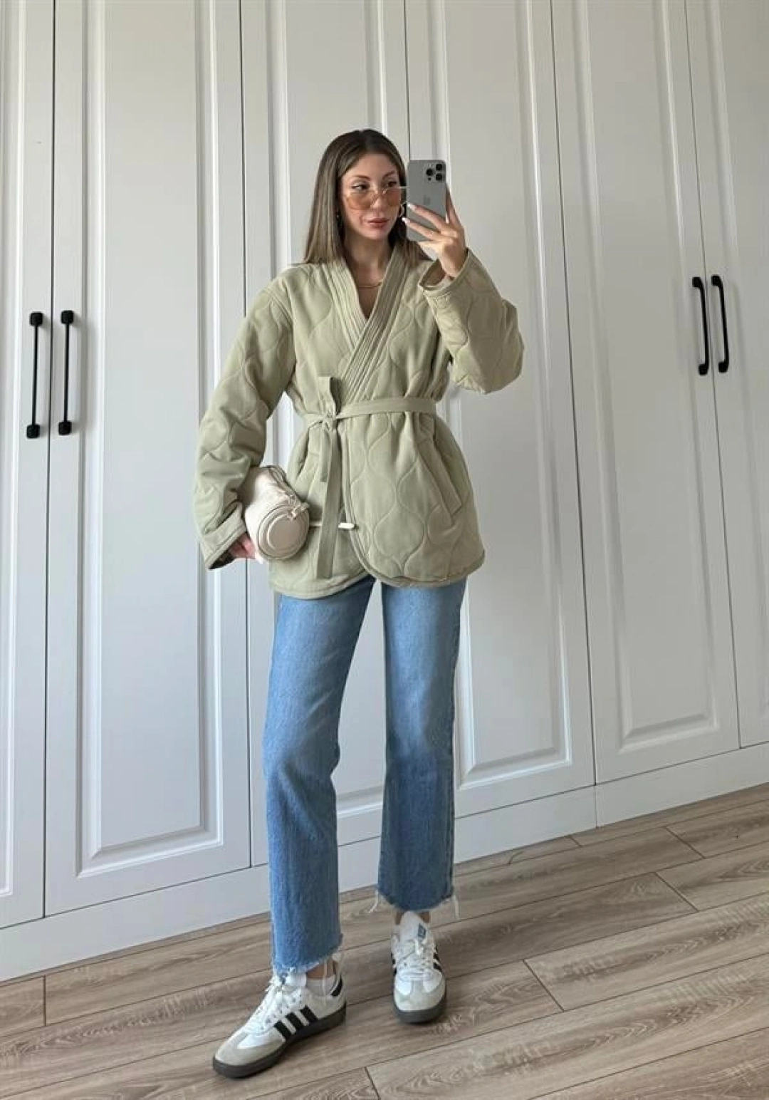 Kuşaklı Astarlı Haki Kapitone Ceket