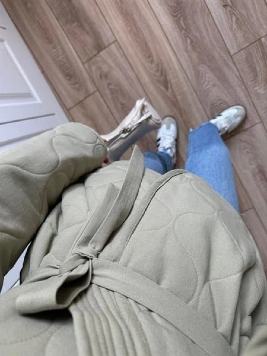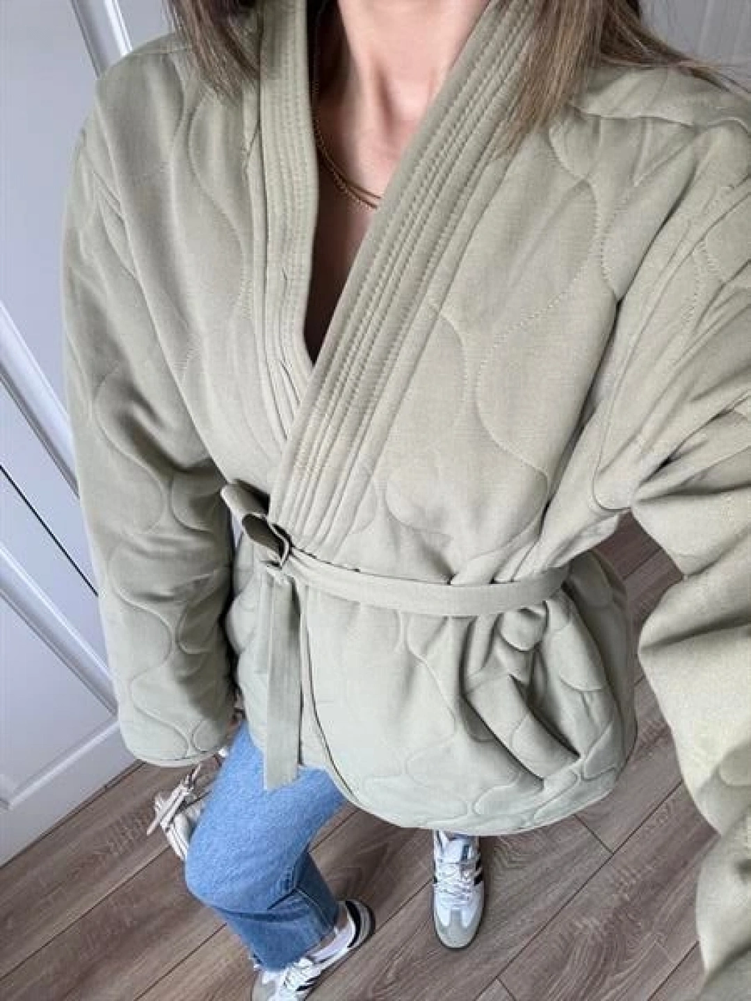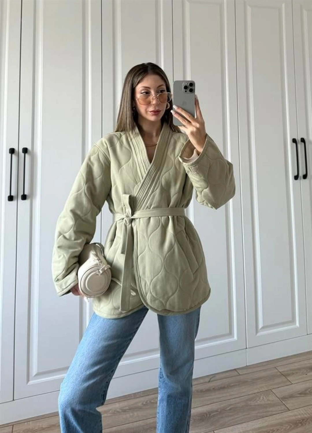 Kuşaklı Astarlı Haki Kapitone Ceket