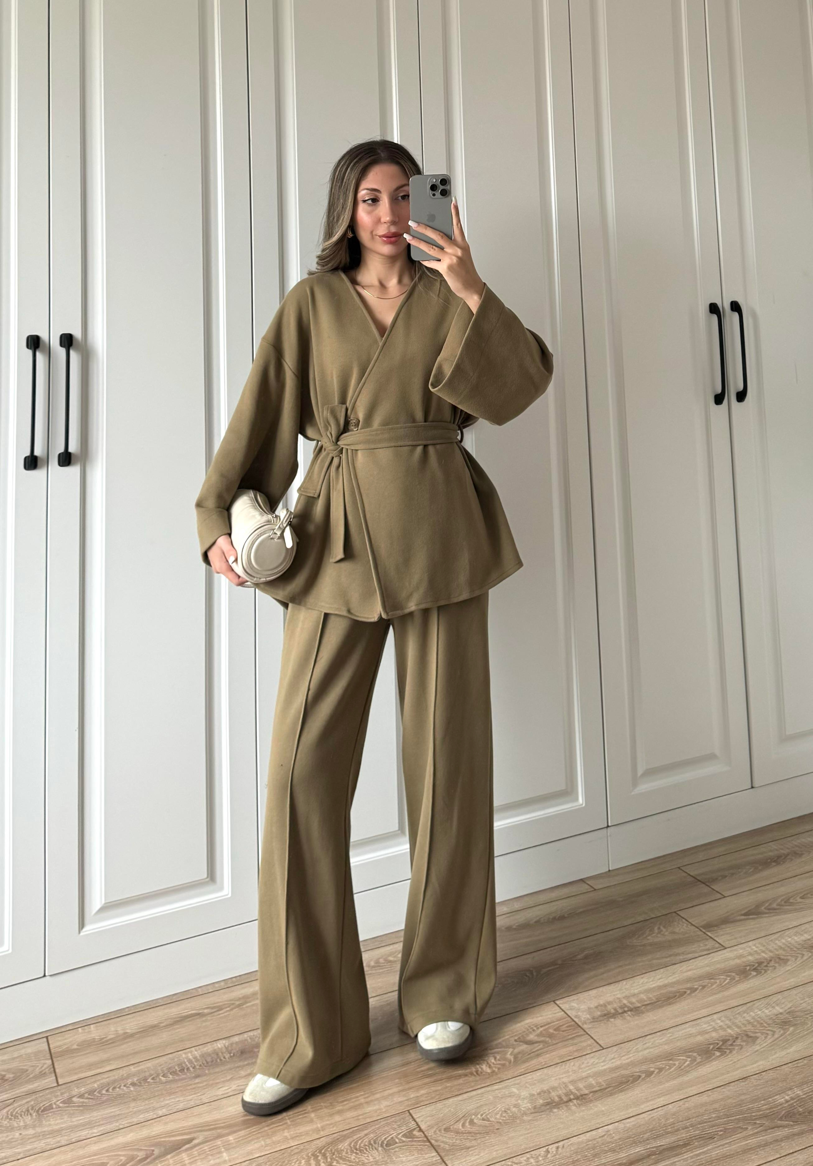 Kuşaklı Nervür Dikişli Örme Haki Takım