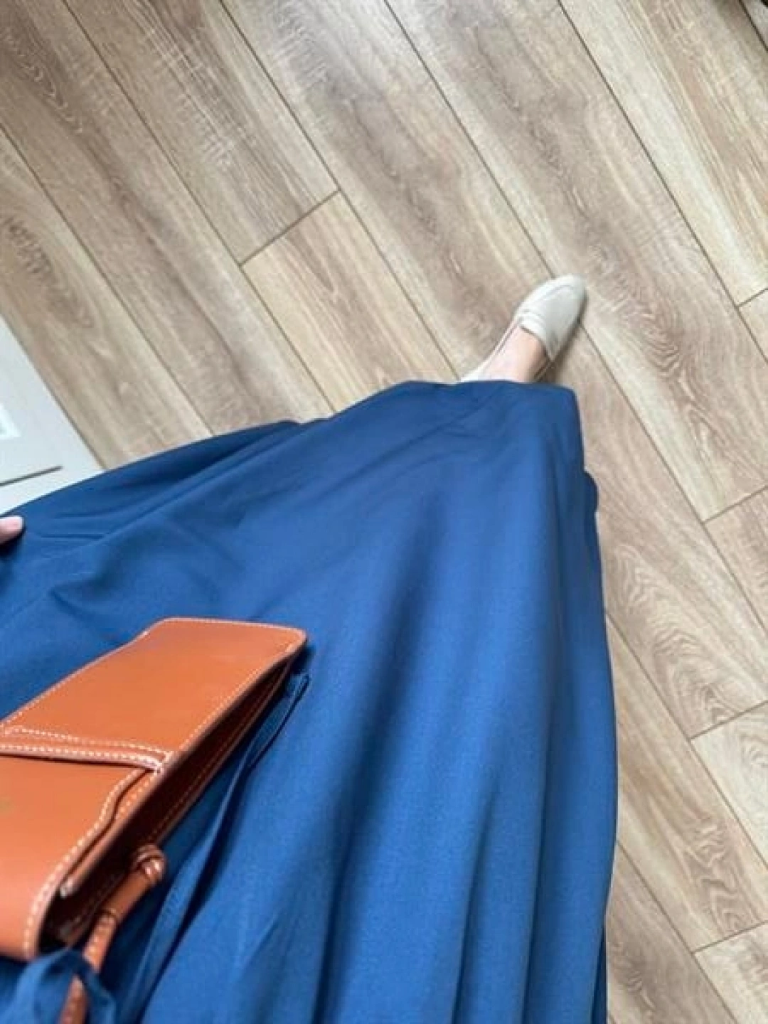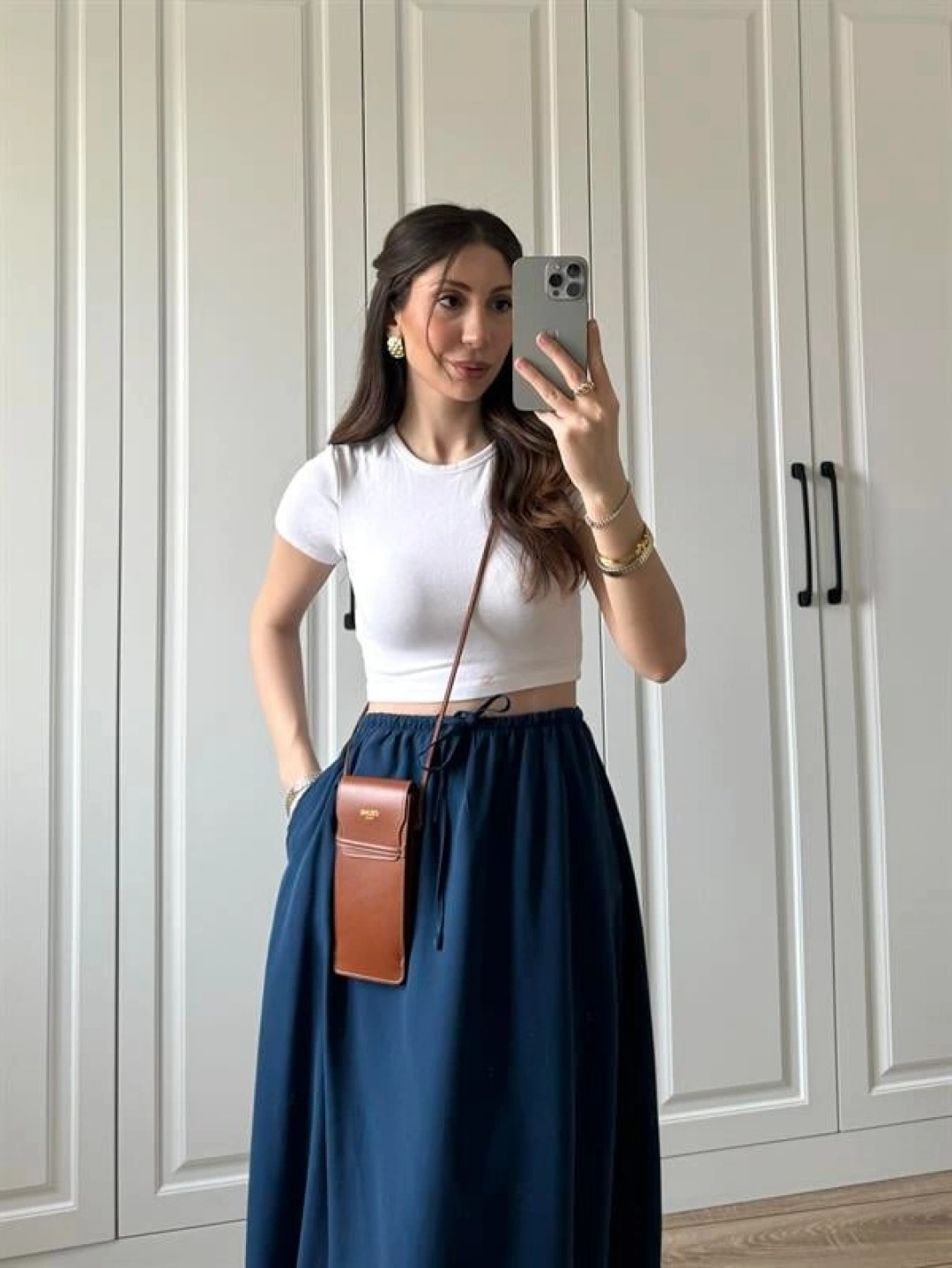 Beli Lastikli Lacivert Tensel Kırışık Etek