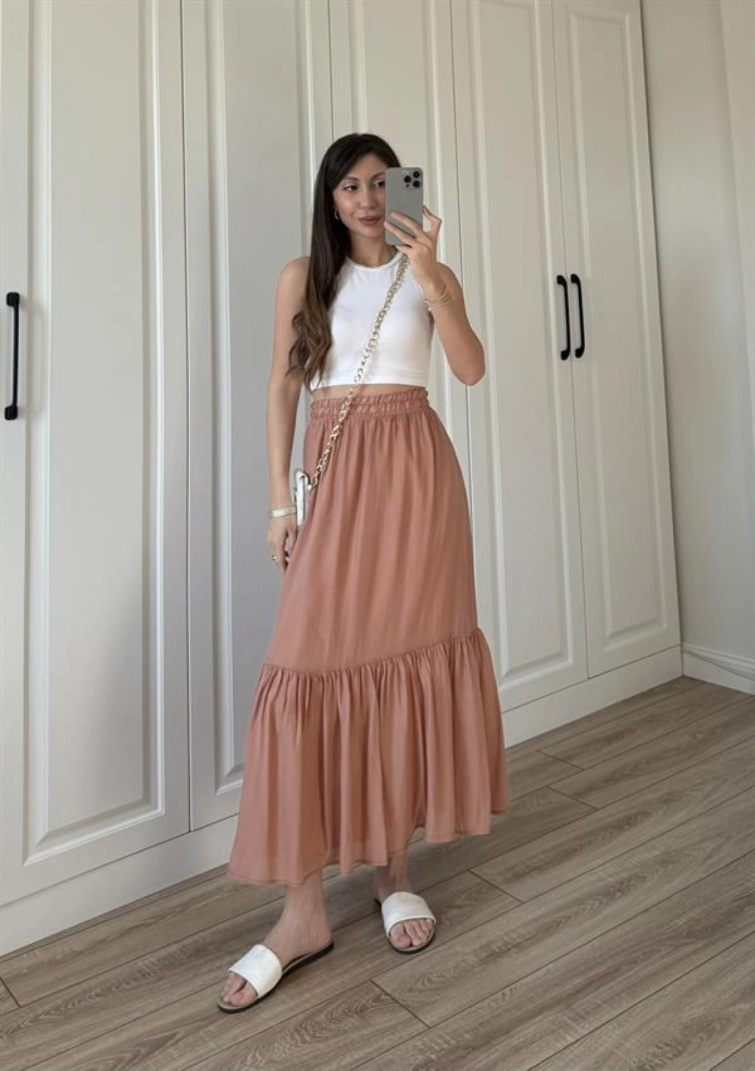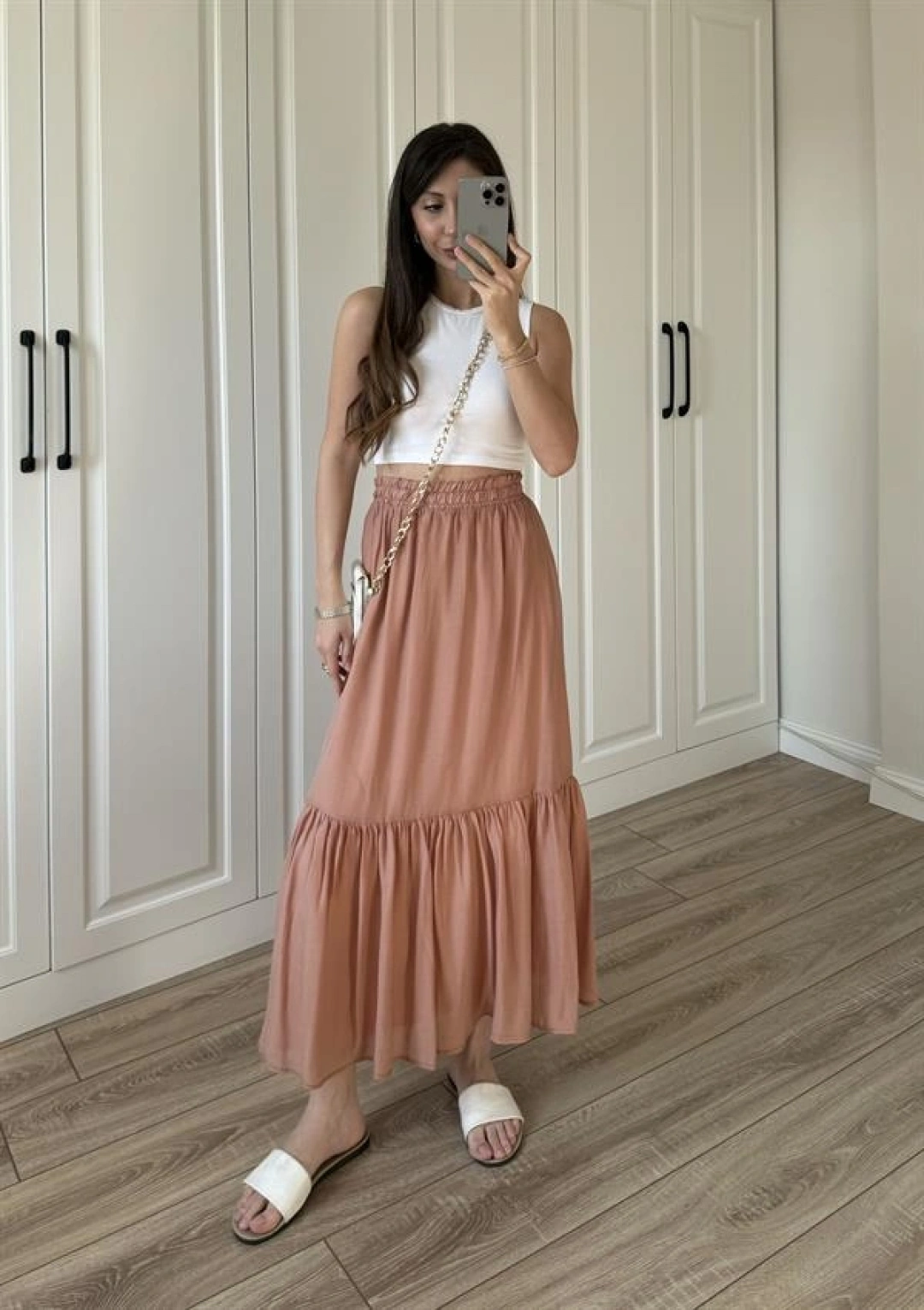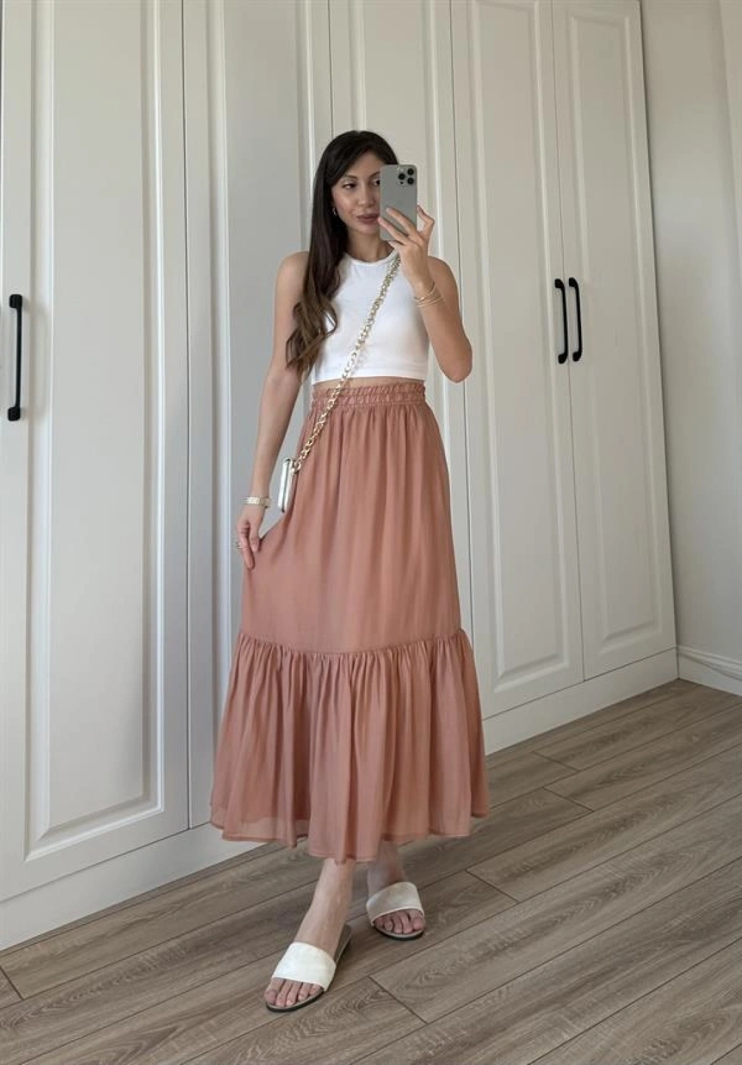 Beli Lastikli Tarçın Tensel Kırışık Etek