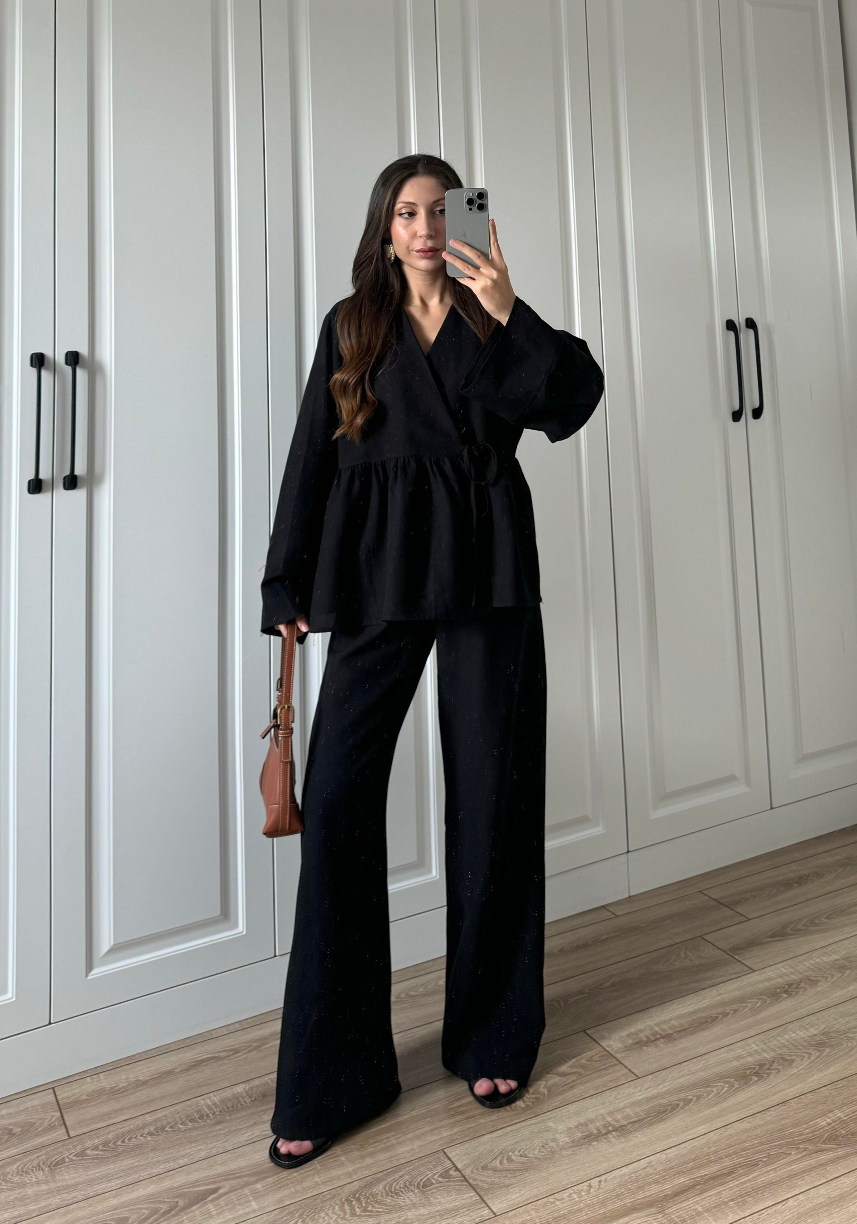 Milos Yandan Bağlamalı Keten Siyah Kimono Takım
