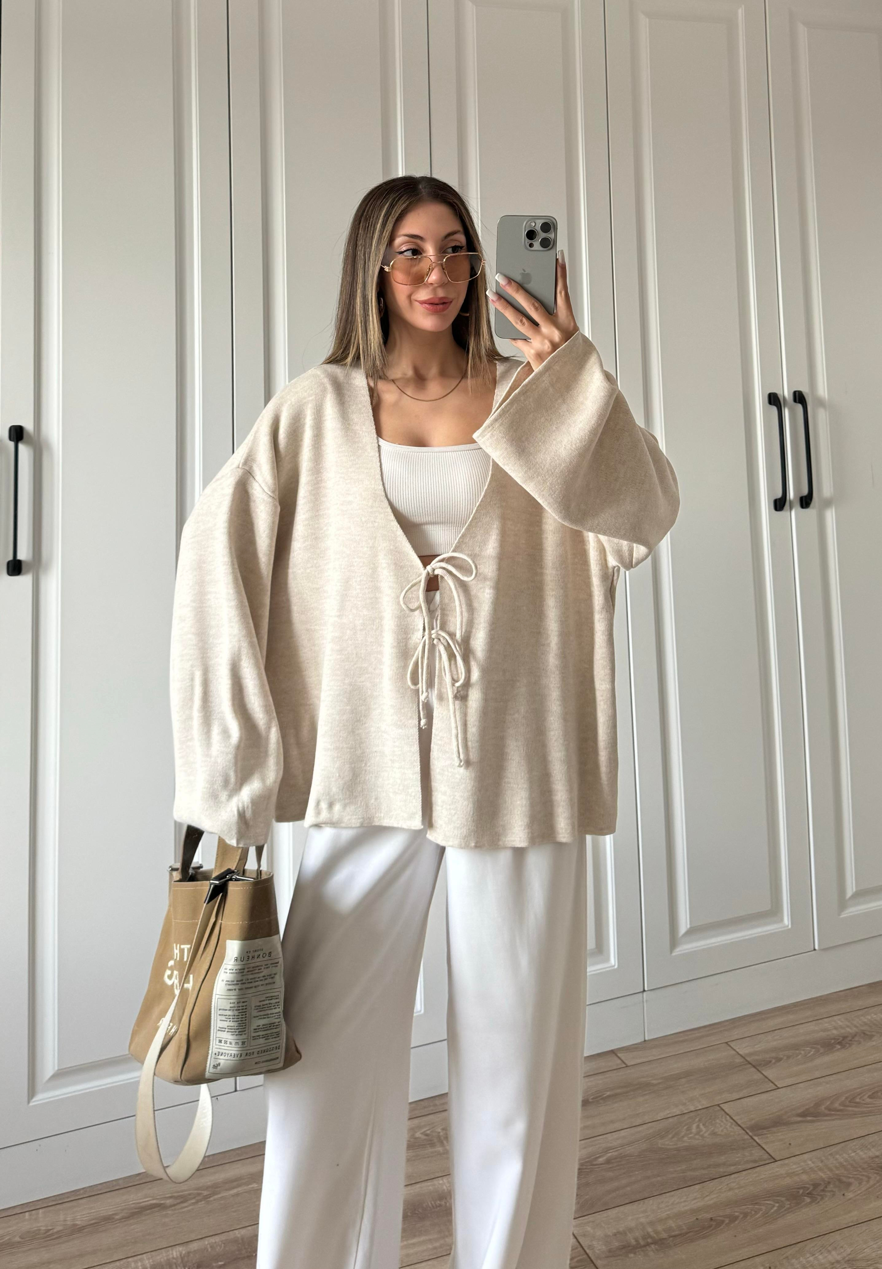 Önü Bağlamalı Taş Triko Hırka