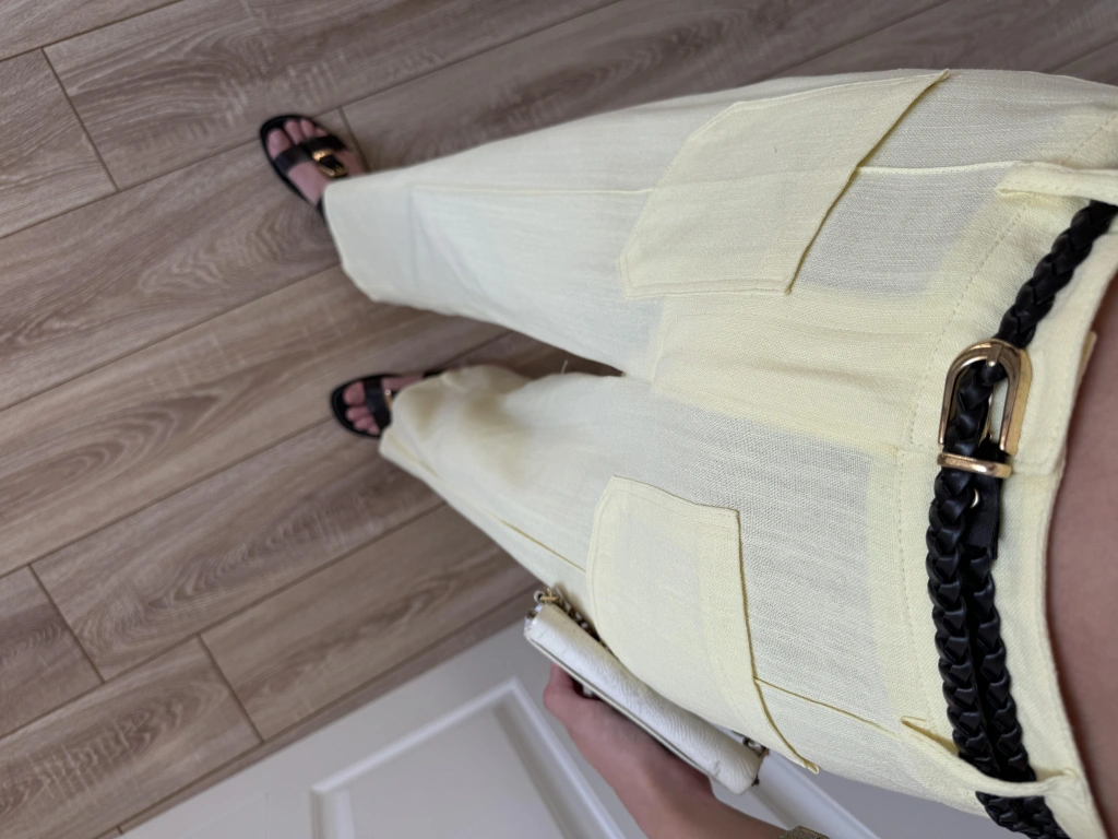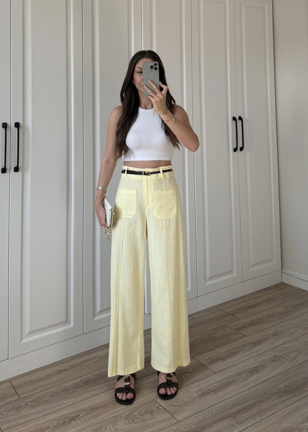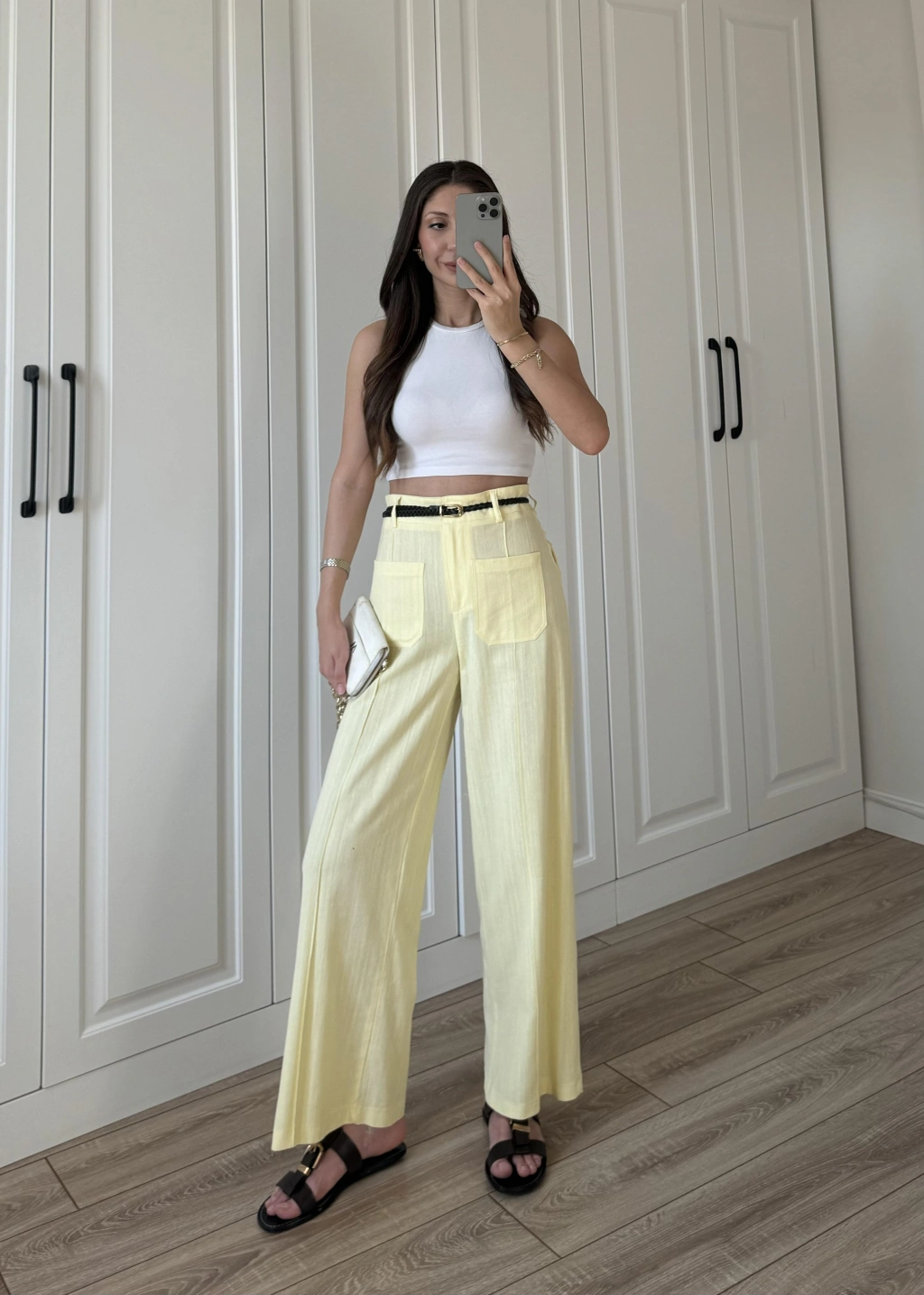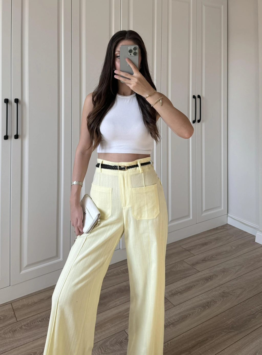 Örgü Kemerli Önü Cepli Keten Premium Sarı Pantolon
