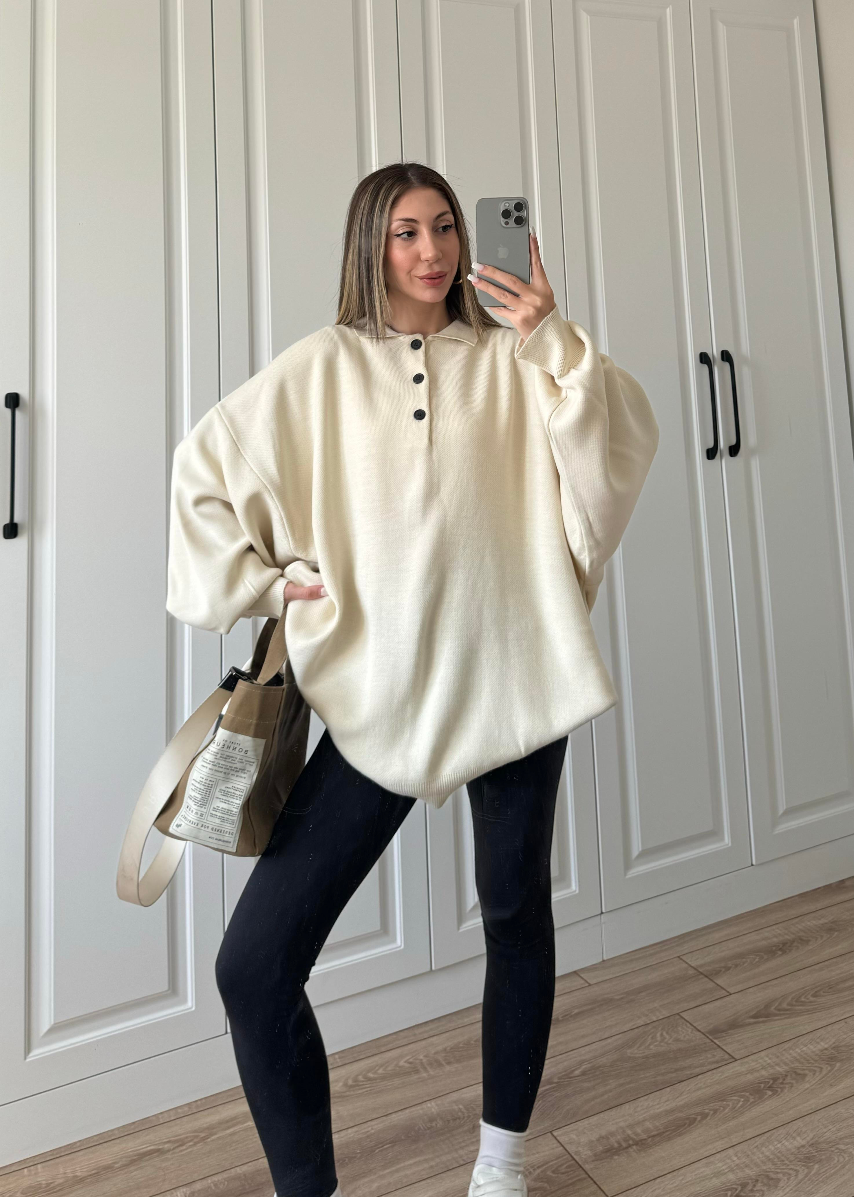 Polo Yaka Ekstra Oversize Salaş Bej Triko Kazak