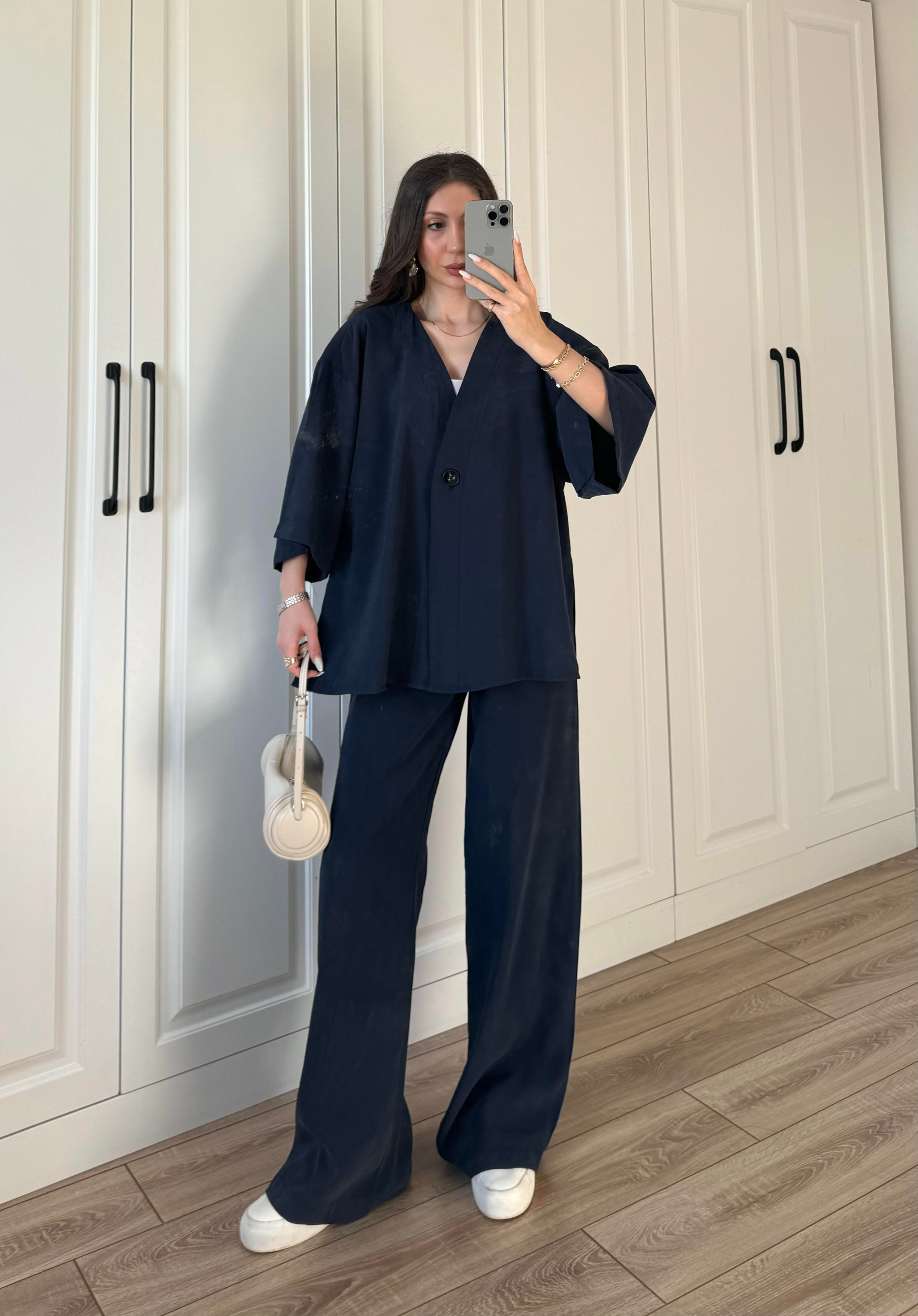 Safir Tek Düğmeli Tensel Oversize Lacivert Takım