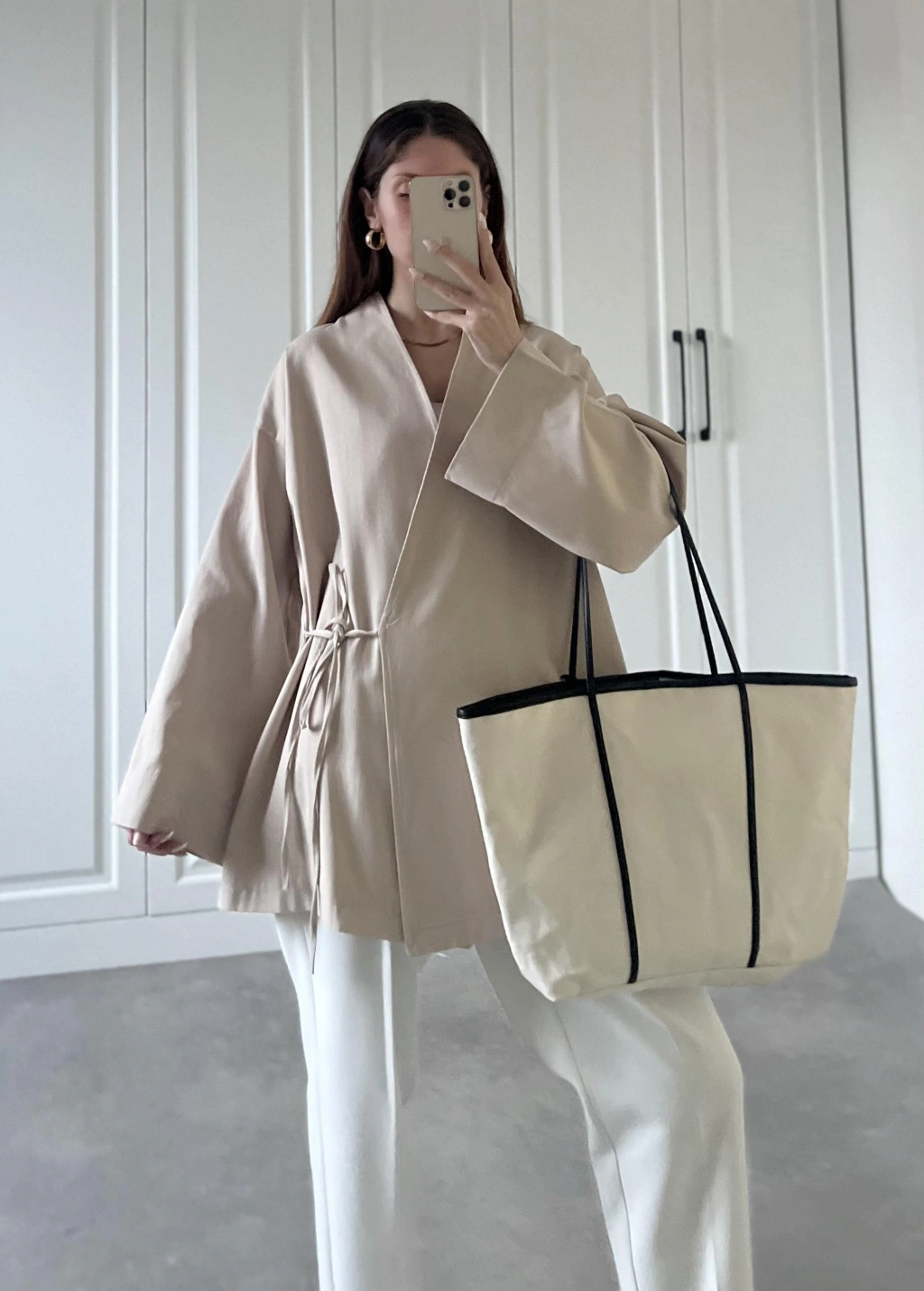 Beyaz Yandan Bağlamalı Gabardin Kimono Ceket