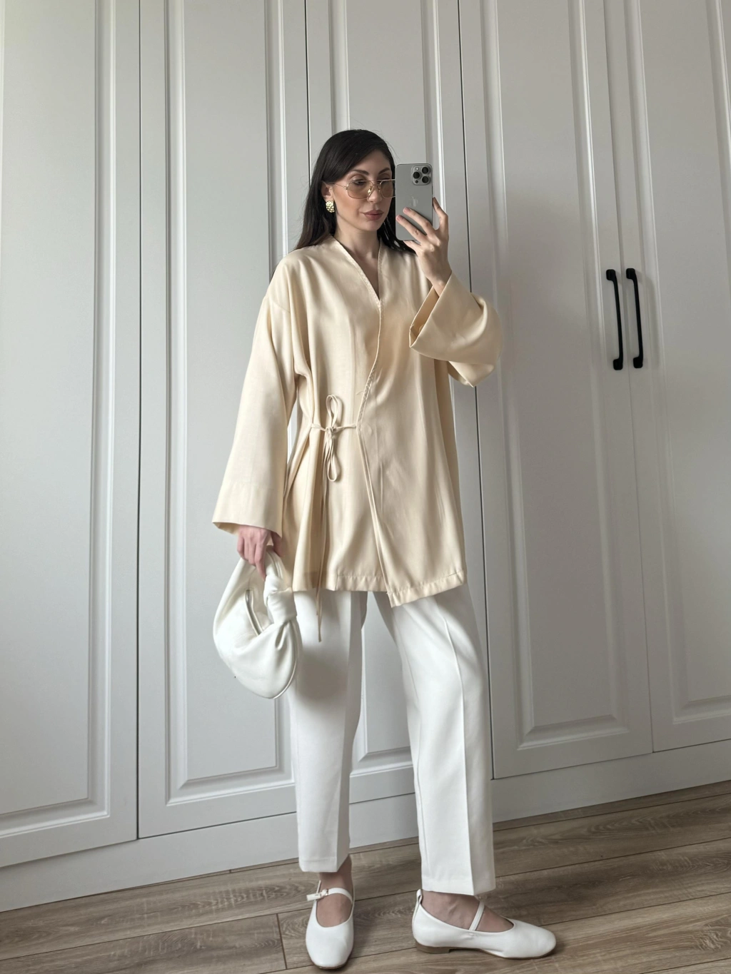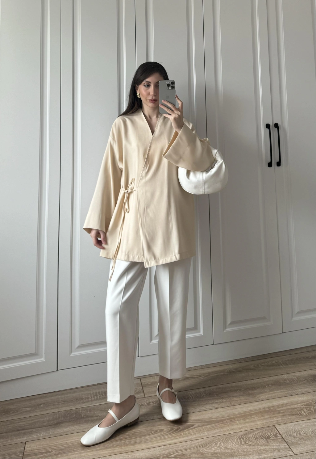 Beyaz Yandan Bağlamalı Gabardin Kimono Ceket