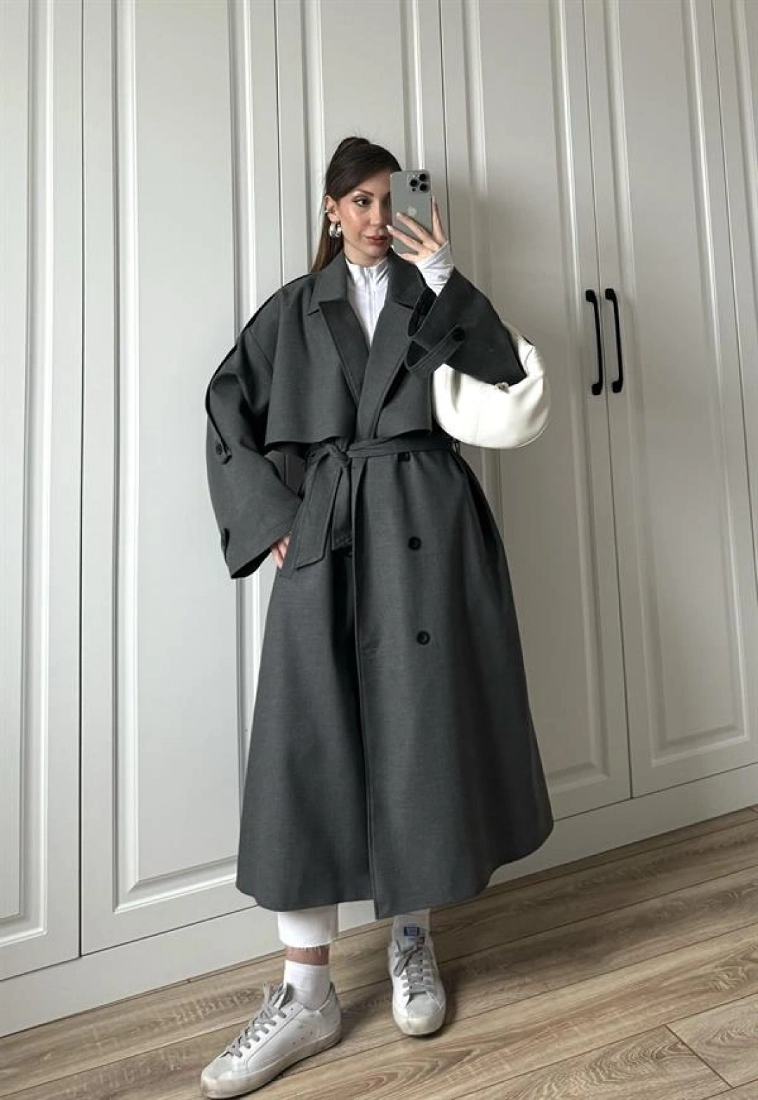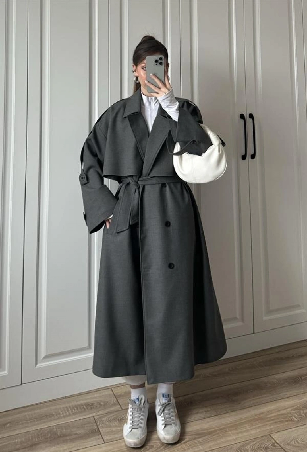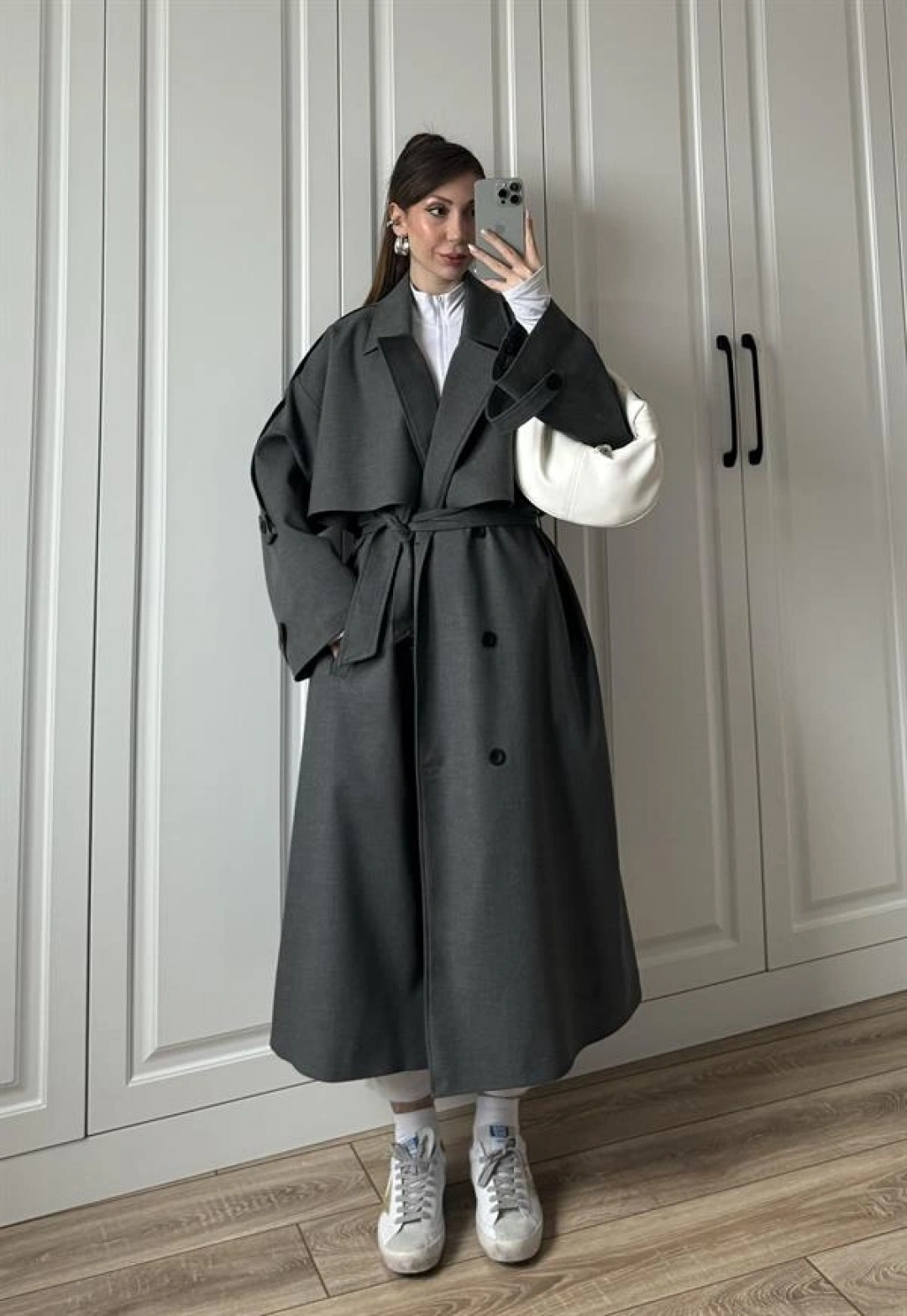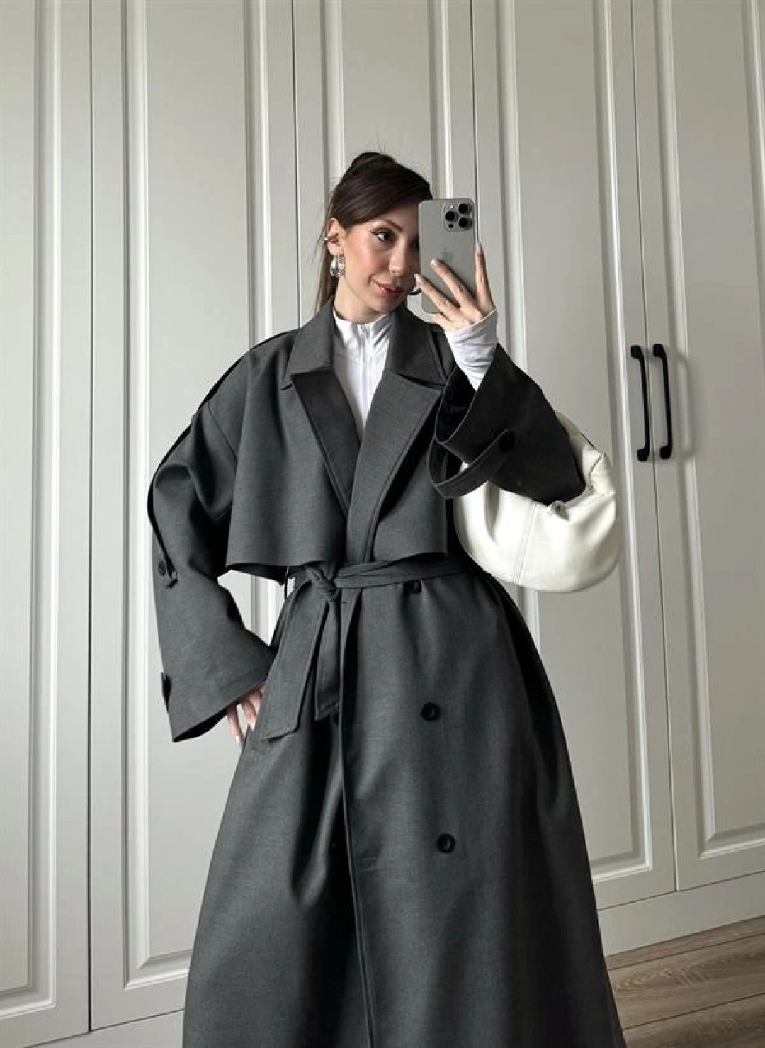 Rose Oversize Kuşaklı Antrasit Trençkot