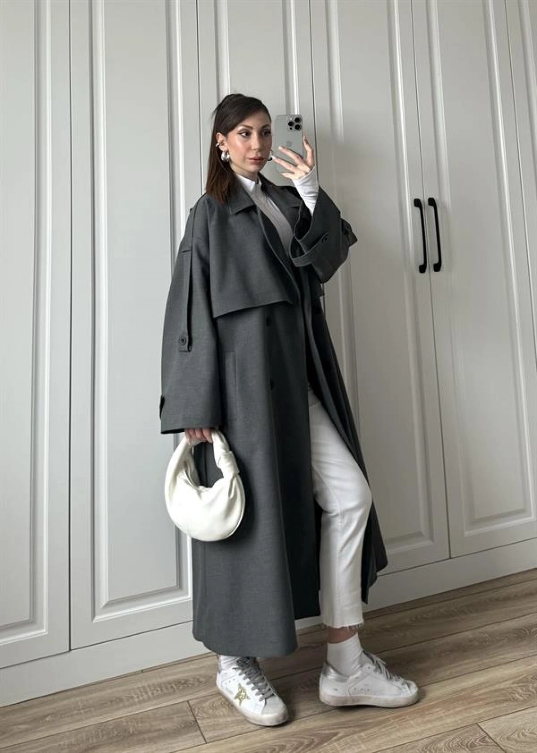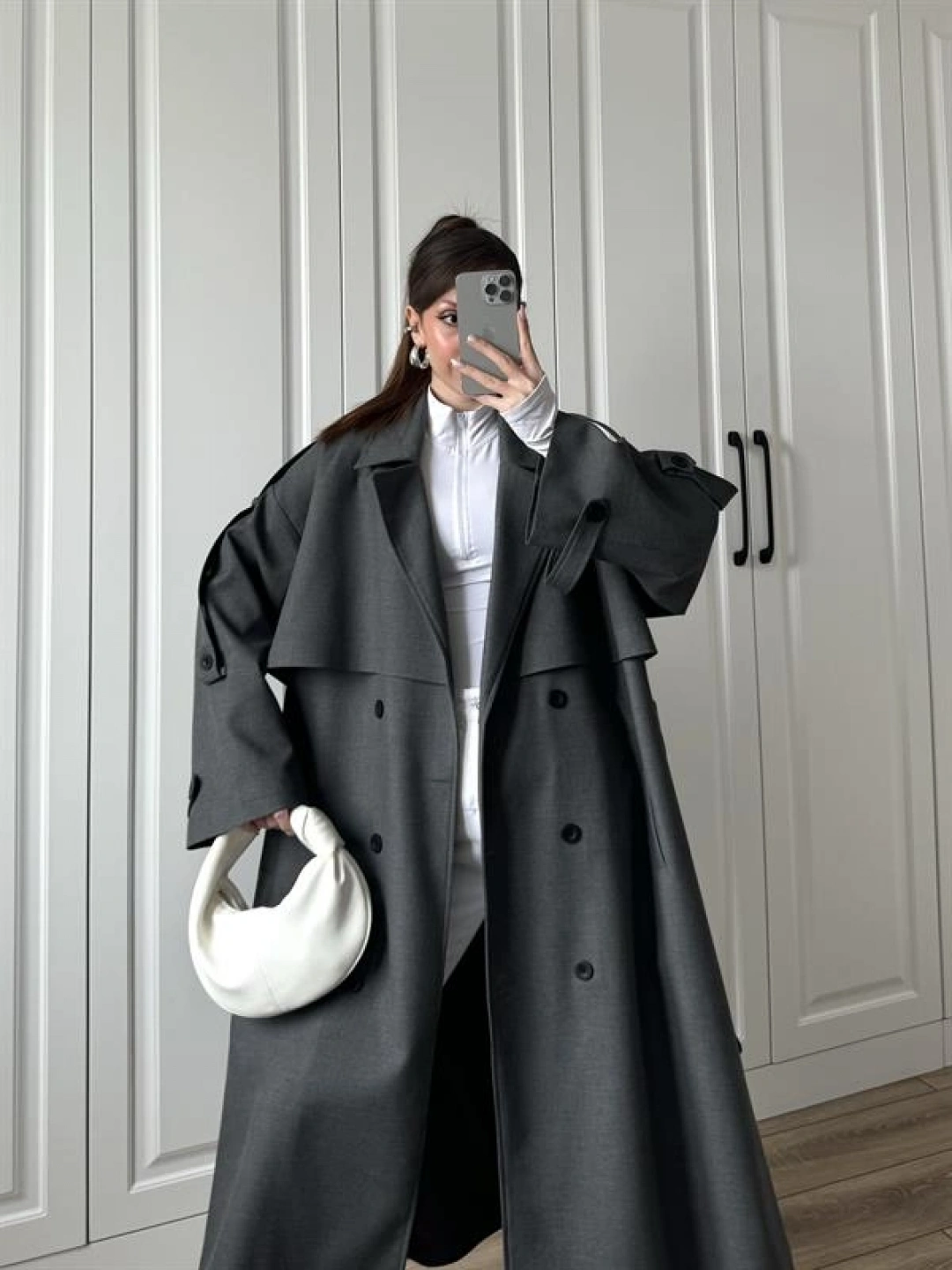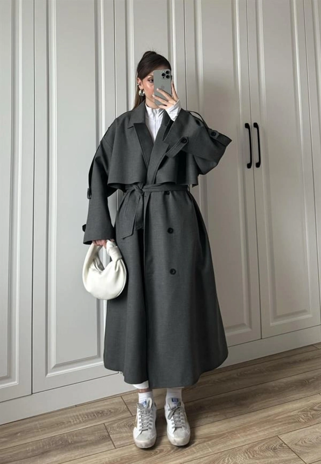 Rose Oversize Kuşaklı Antrasit Trençkot